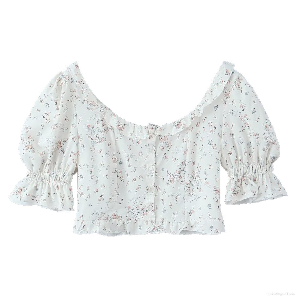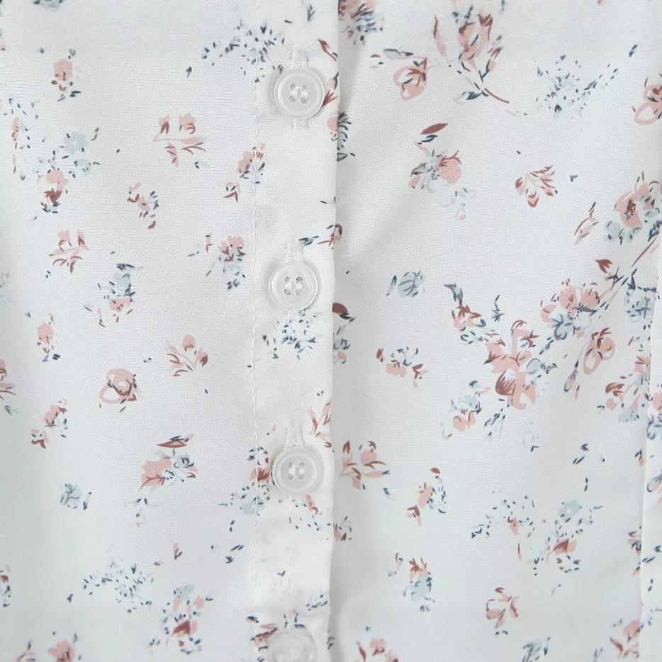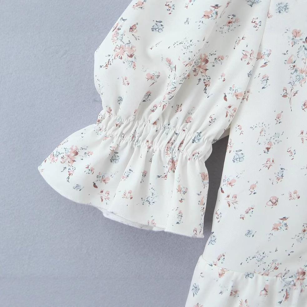 Small Floral, Ruffles, Plants And Flowers, Backless, Button, Puff Sleeves, Tightening
