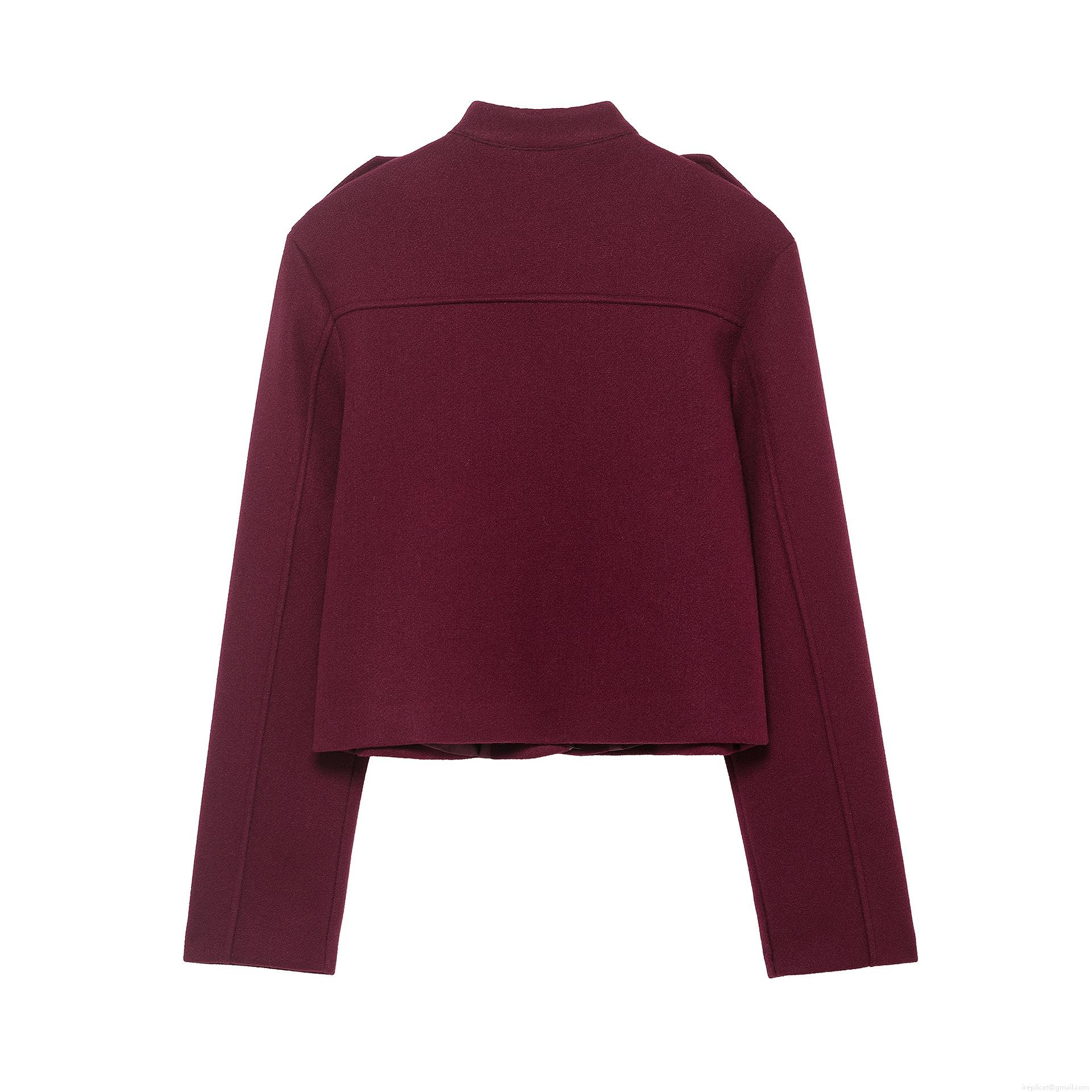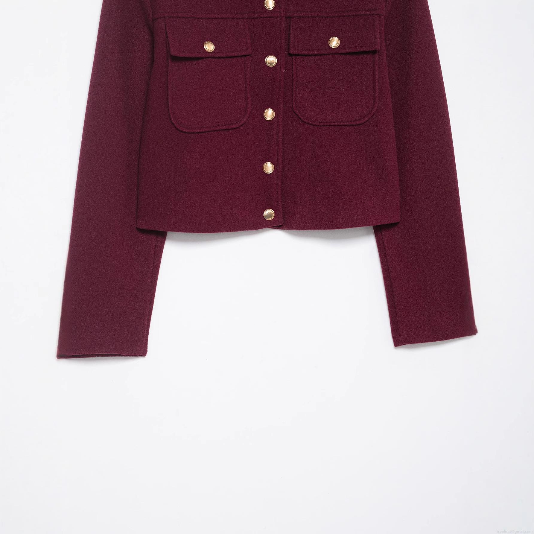 Women's French Style Wine Red Woolen Texture Jacket Elegant Stand Collar Long Sleeve Short Coat With Gold Metal Buttons Slim Fit Fashion Outerwear