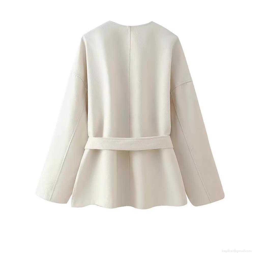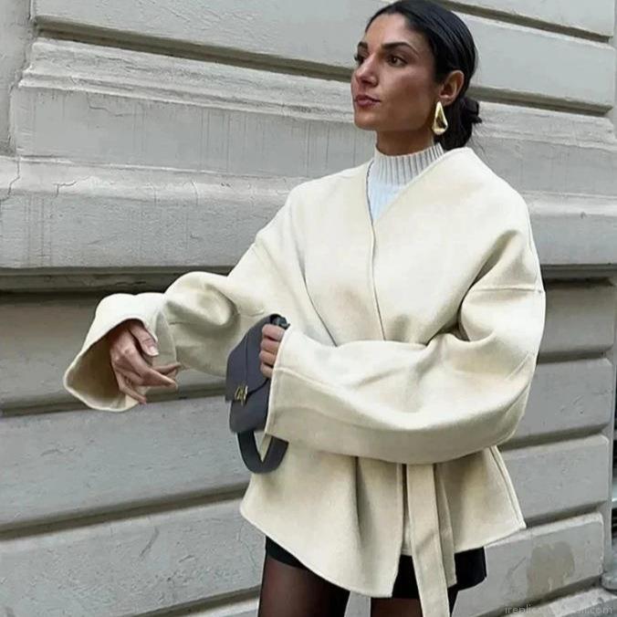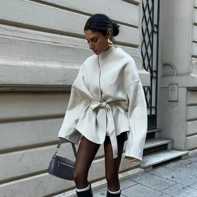 Women's French Style Woolen Feel Jacket Loose Casual Outerwear With Tie Belt Solid Color Lapel Long Sleeve Coat For Autumn Winter Streetwear Lady