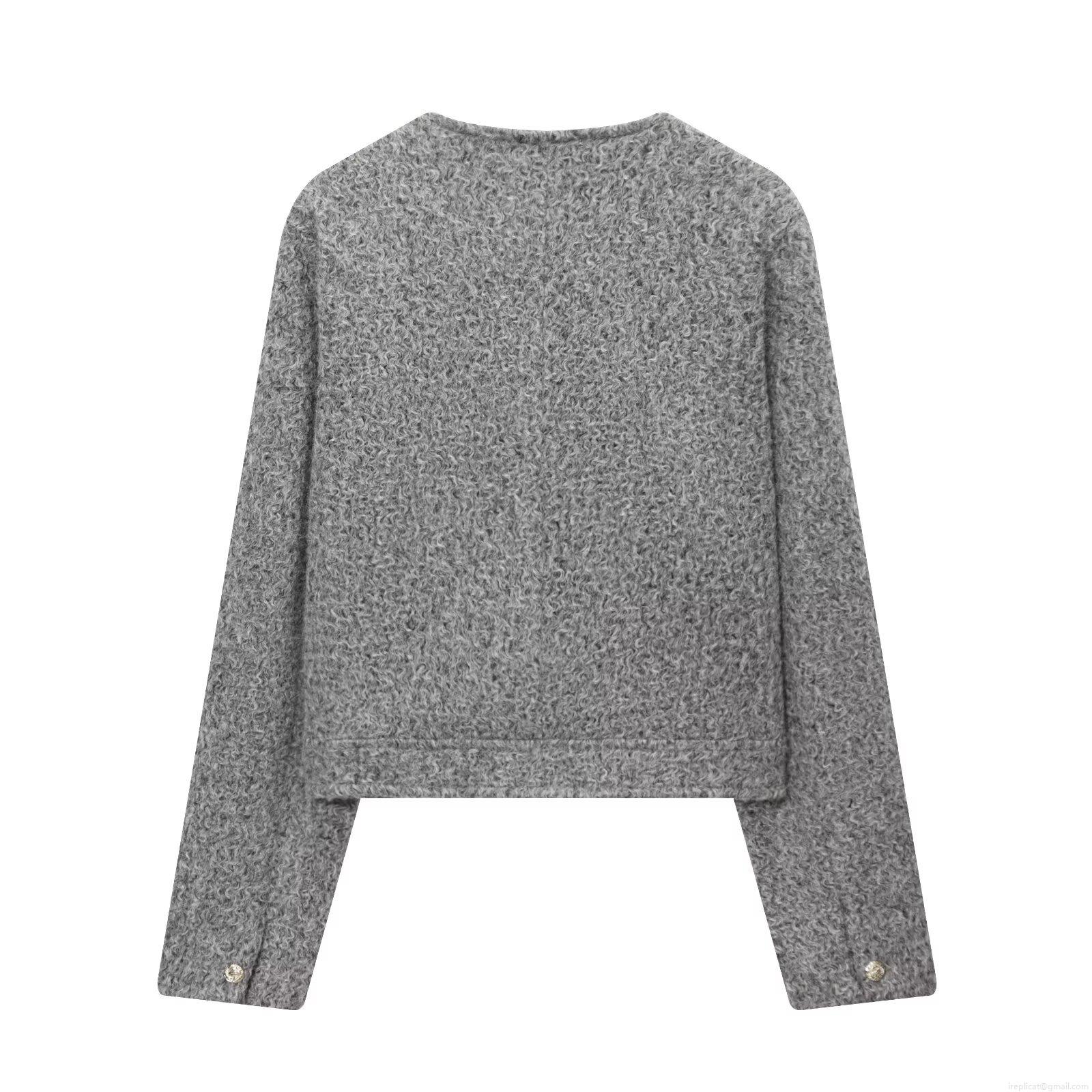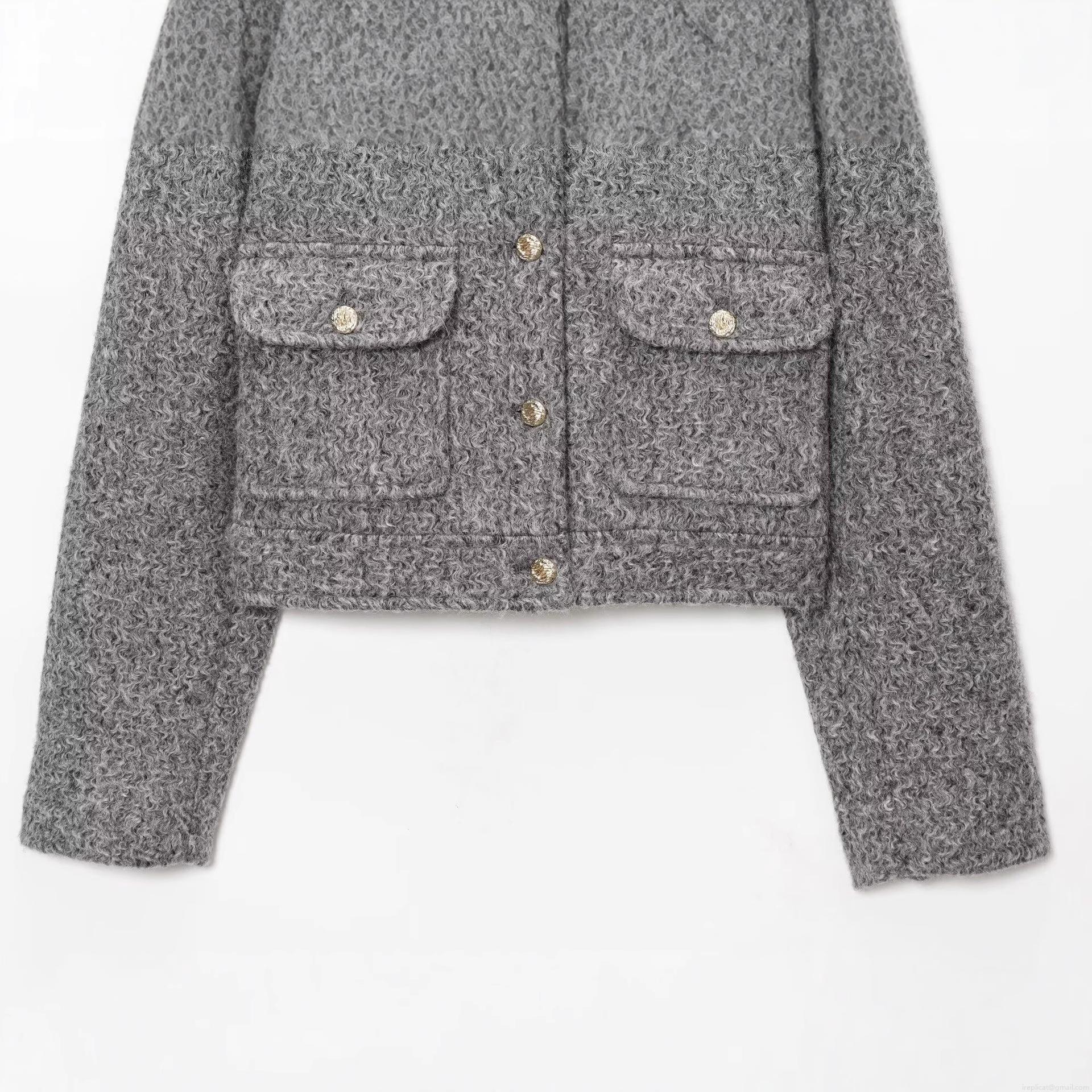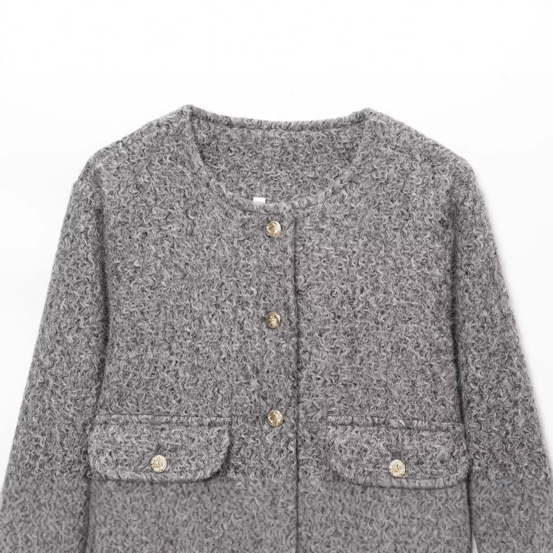 Women's Grey Tweed Jacket Elegant Round Neck Gold Button Long Sleeve Coat Casual Socialite Office Outwear for Ladies