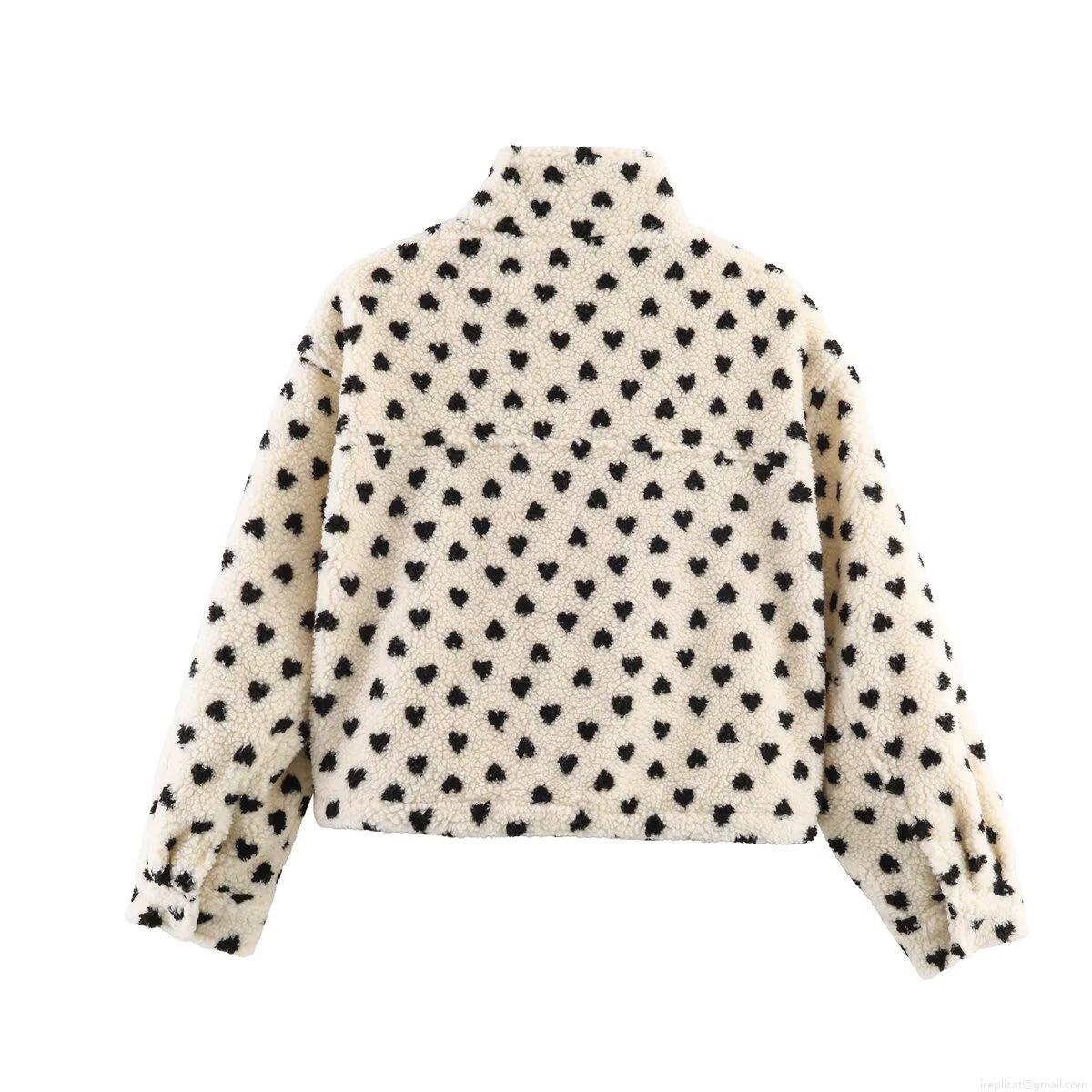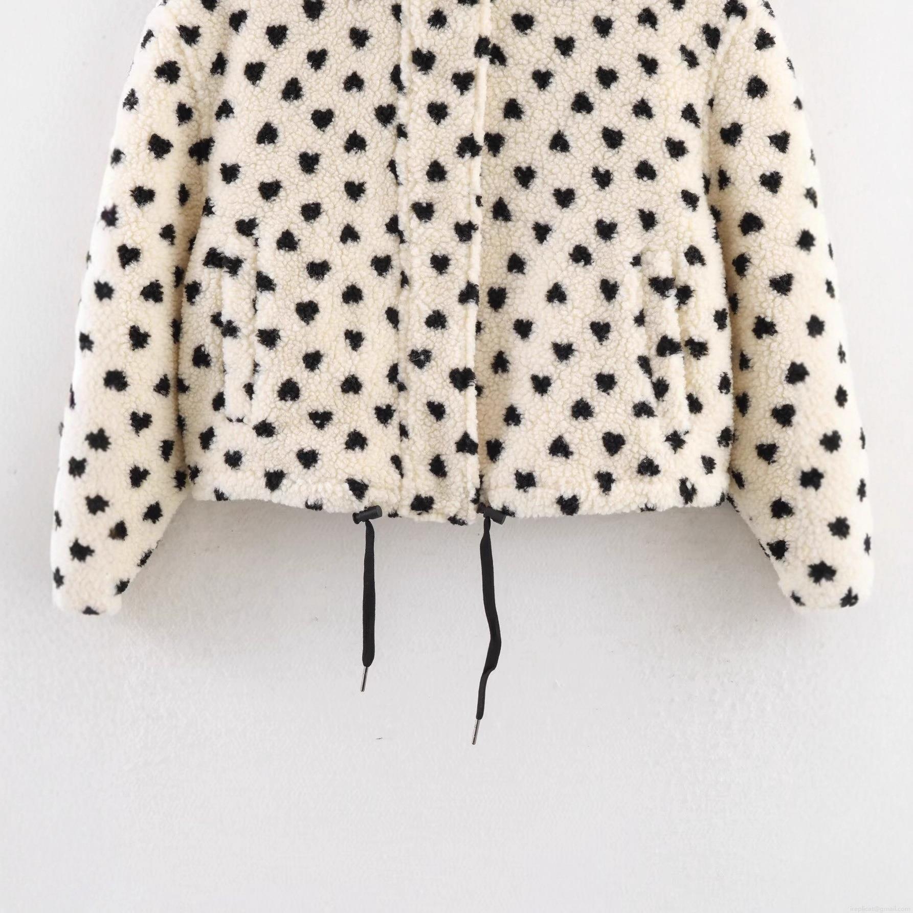 Women's Heart Print Sherpa Fleece Jacket Loose Stand Collar Full Zip Short Coat Warm Winter Streetwear Outerwear With Drawstring Hem