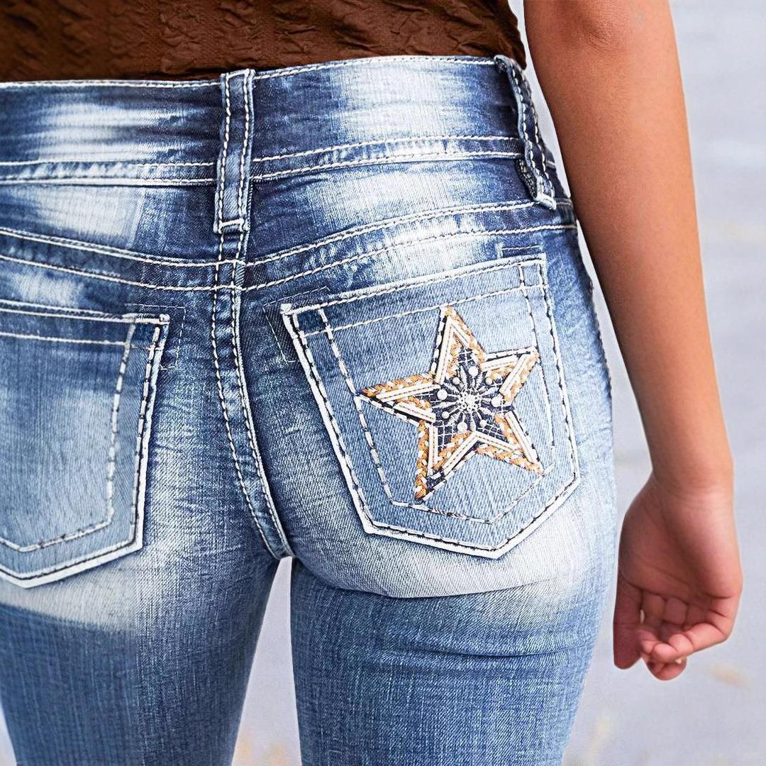 Women's High Stretch Bootcut Denim Jeans With Star Embroidery Cotton Blend Distressed Washed Blue Slim Fit Straight Leg Long Pants For Women Streetwear Sexy Trousers
