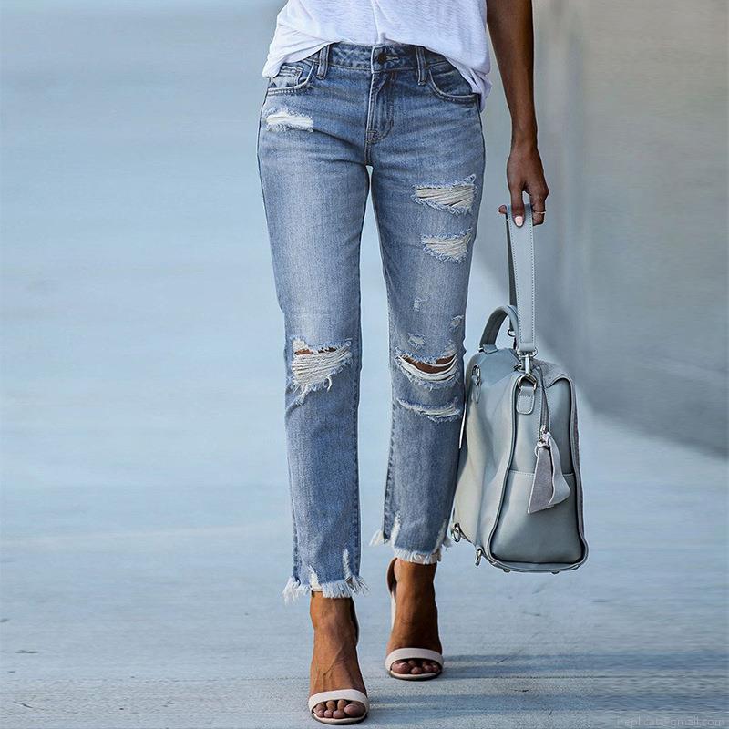 Women's High Stretch Ripped Denim Jeans Slim Fit Distressed Pencil Pants Fringed Hem Street Style Cotton Blend Solid Color Long Trousers