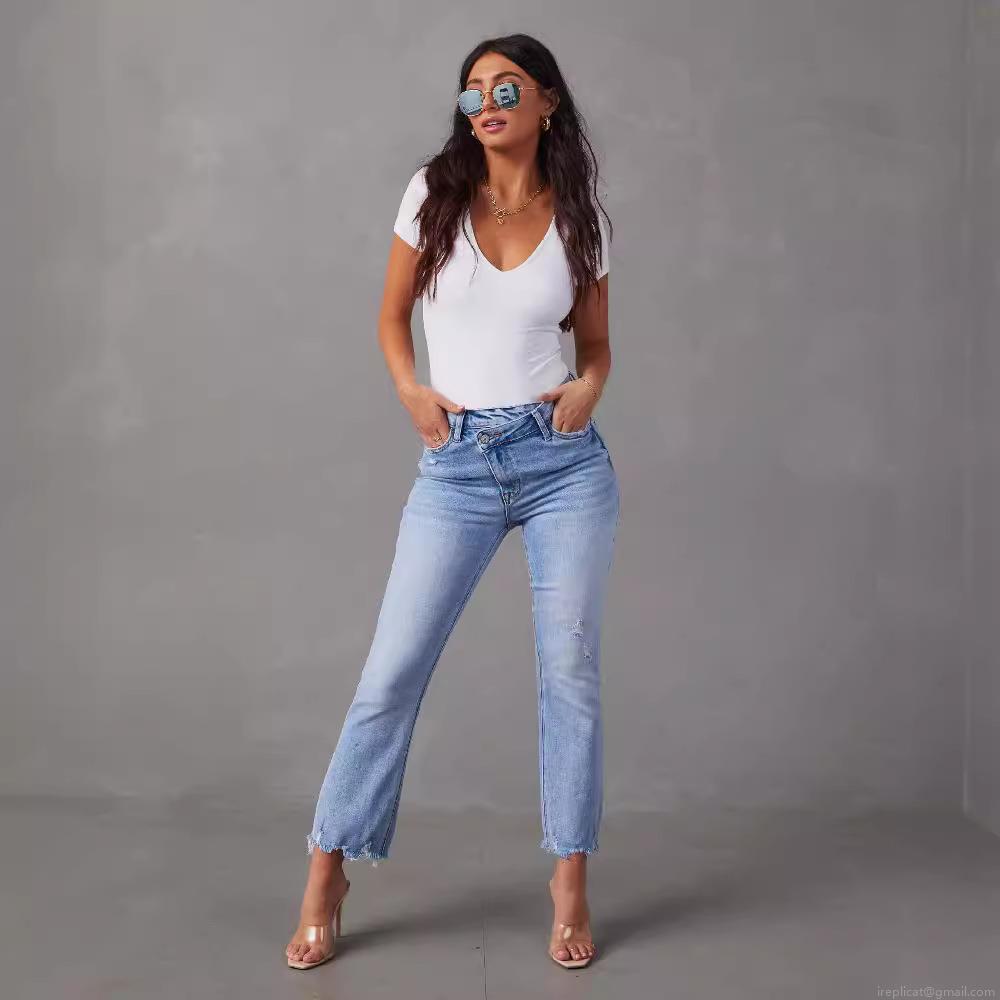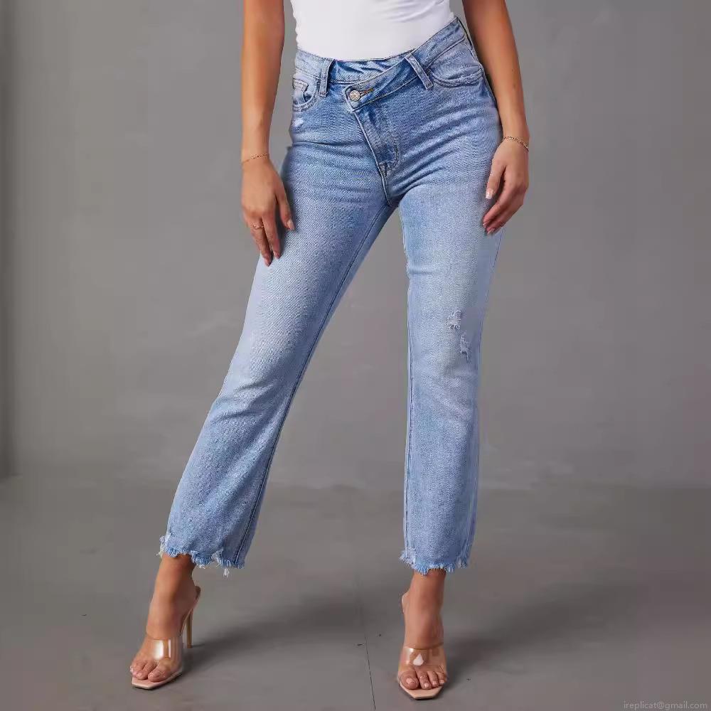 Women's High Waist Asymmetrical Criss Cross Denim Jeans Distressed Ripped Wide Leg Straight Long Pants Streetwear Washed Light Blue Cotton Trousers for Women