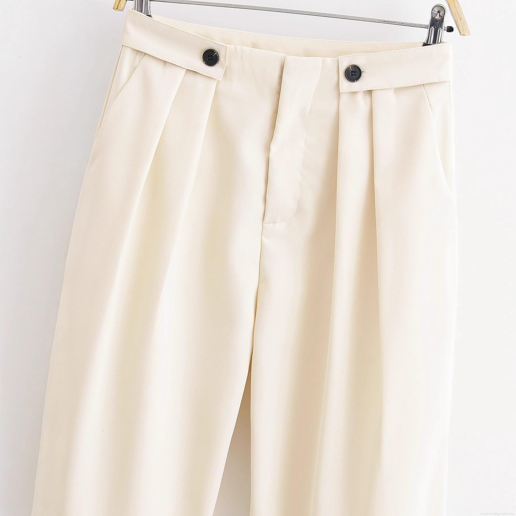 Women's High Waist Casual Trousers 100% Polyester Woven Fabric Straight Leg Pants With Double Button Pleated Detail For Daily Office Wear Elegant Cream White Long Pants