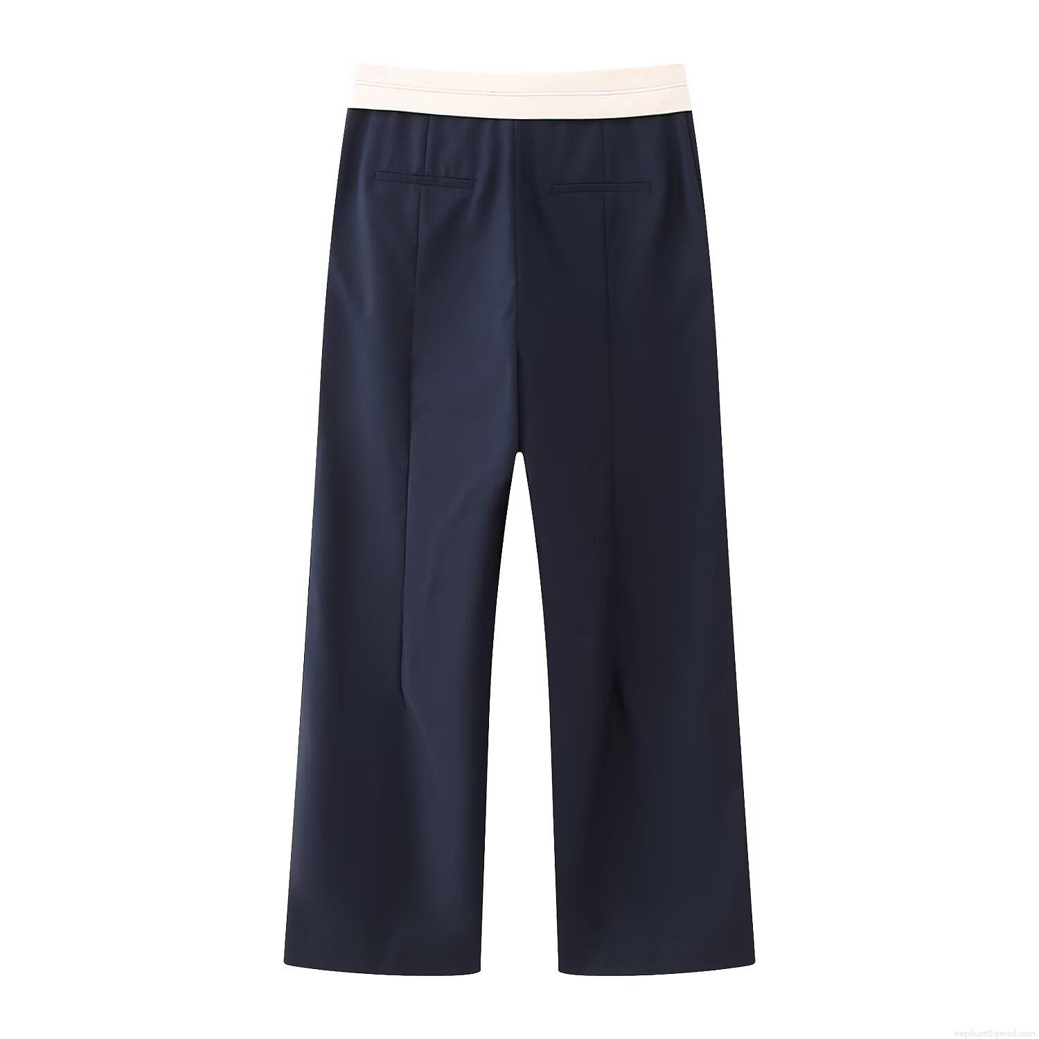 Women's High Waist Contrast Waistband Straight Leg Trousers Casual Loose Suit Pants Autumn Office Commute Navy Blue Fashion Long Pants