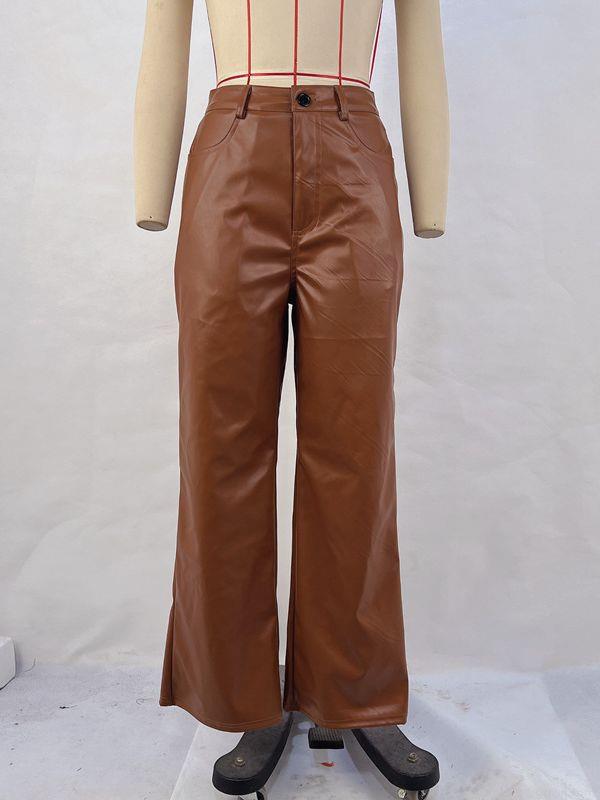 Solid Color, Leather Patchwork, Wide-leg, High-waisted