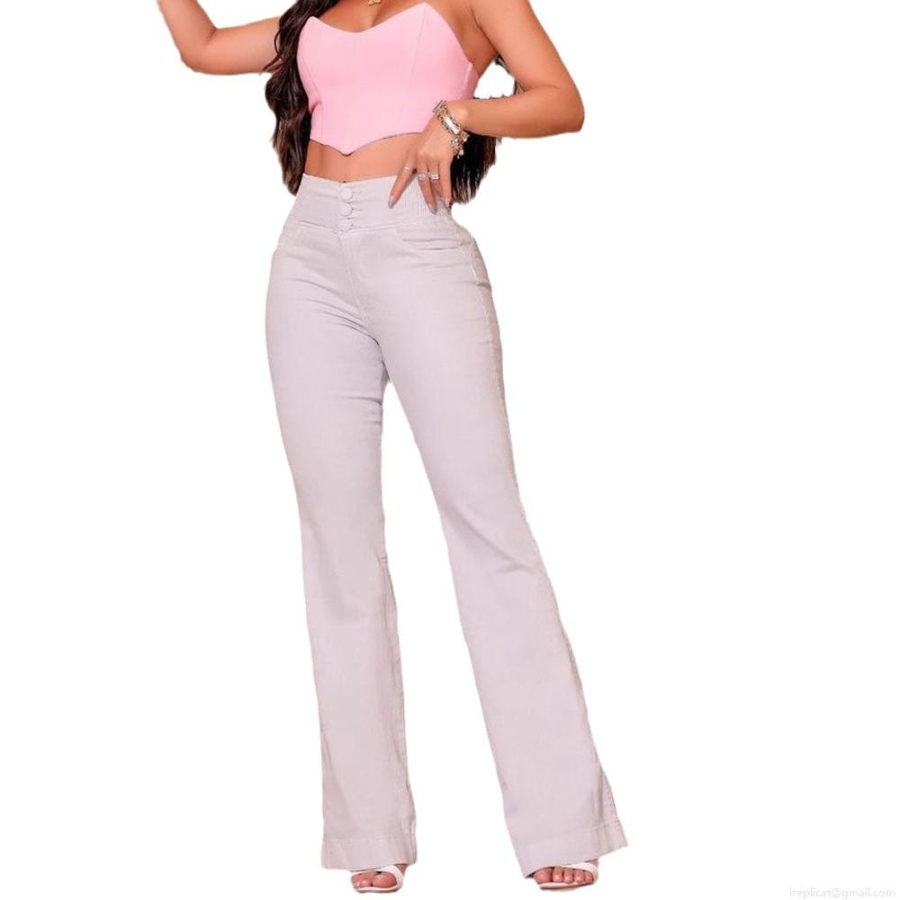 Solid Color, Distressed Water Wash, Button Decoration, Flared Trouser Legs, High-waisted Buttons, Elastic Waistband