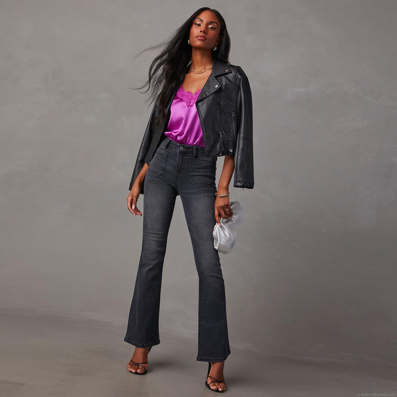 Women's High Waist Flare Jeans Retro Washed Cotton Blend Stretch Slim Fit Denim Trousers With Pockets Streetwear Vintage Style