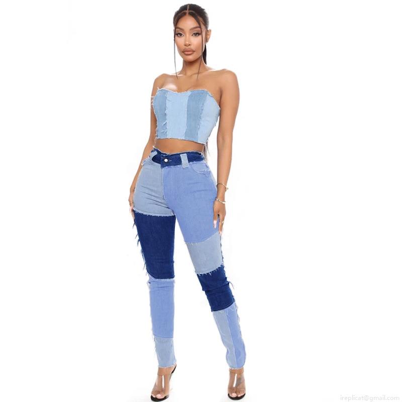 Women's High Waist Patchwork Denim Jeans Stretch Skinny Pencil Pants Spliced Color Block Frayed Hem Trousers Streetwear Casual Fashion Denim Pants