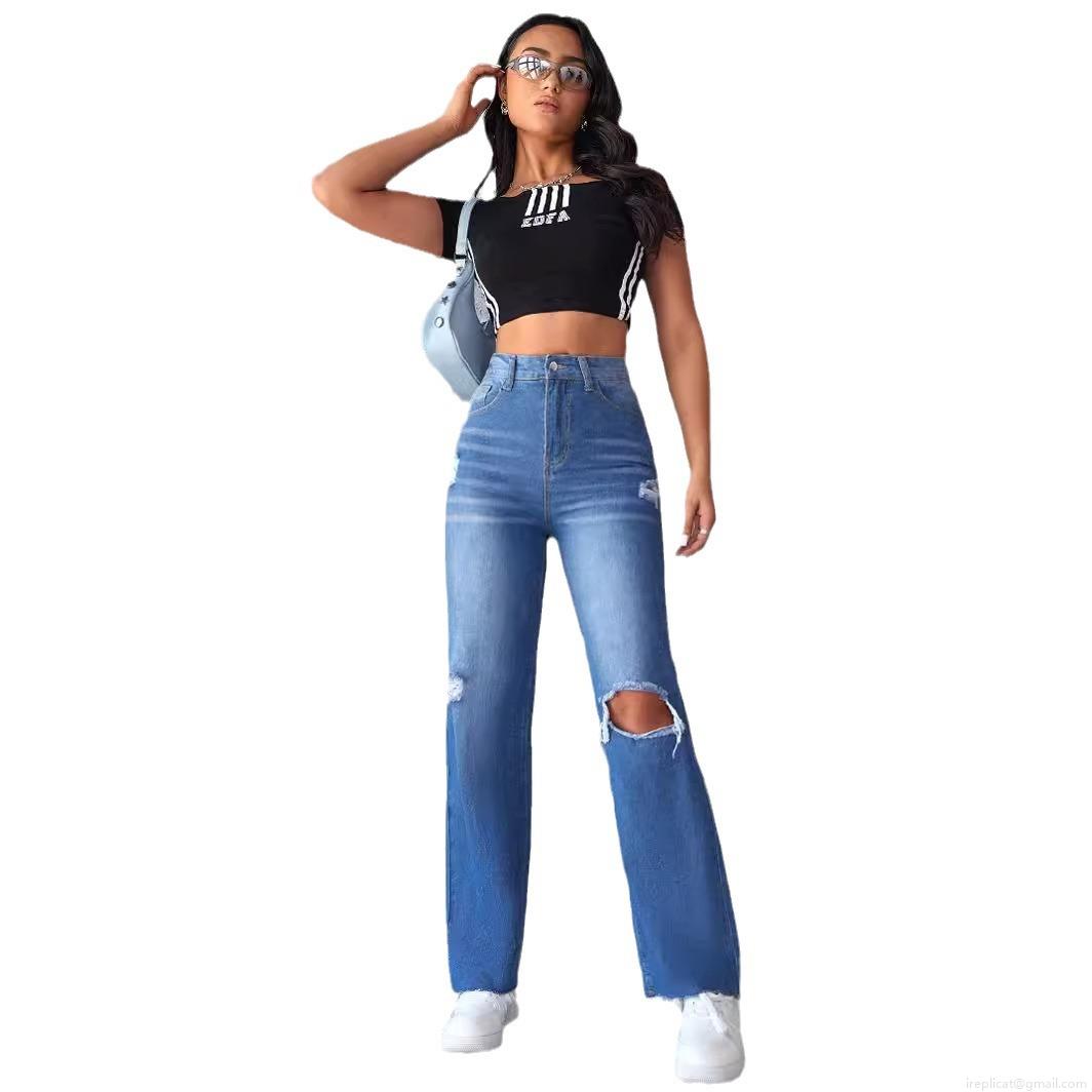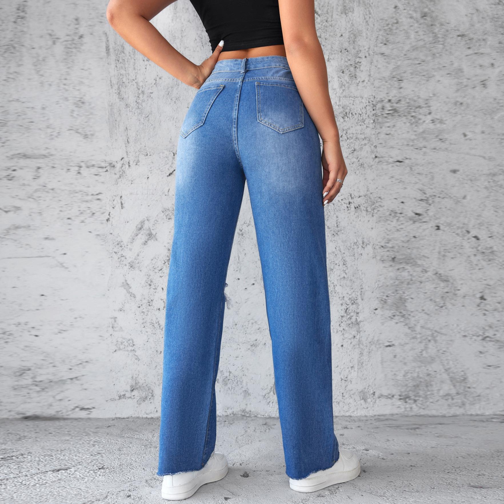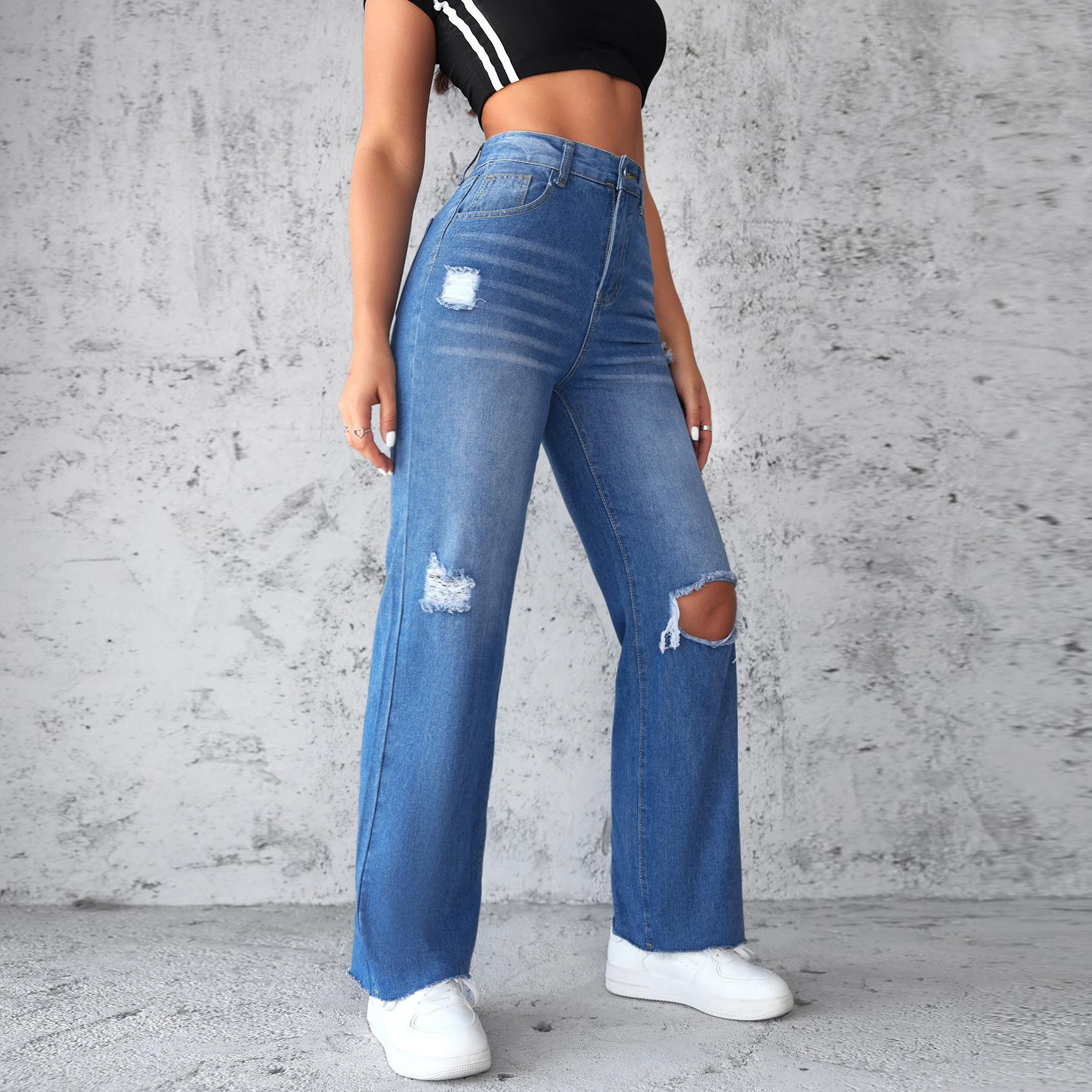 Women's High Waist Ripped Jeans Straight Leg Wide Leg Denim Pants Distressed Frayed Hem Washed Blue Cotton Blend Streetwear Casual Long Trousers
