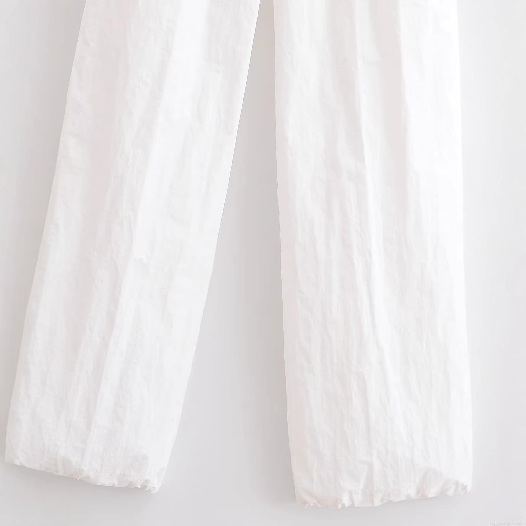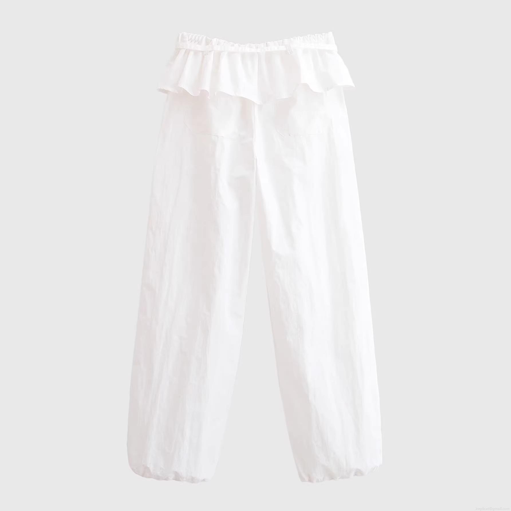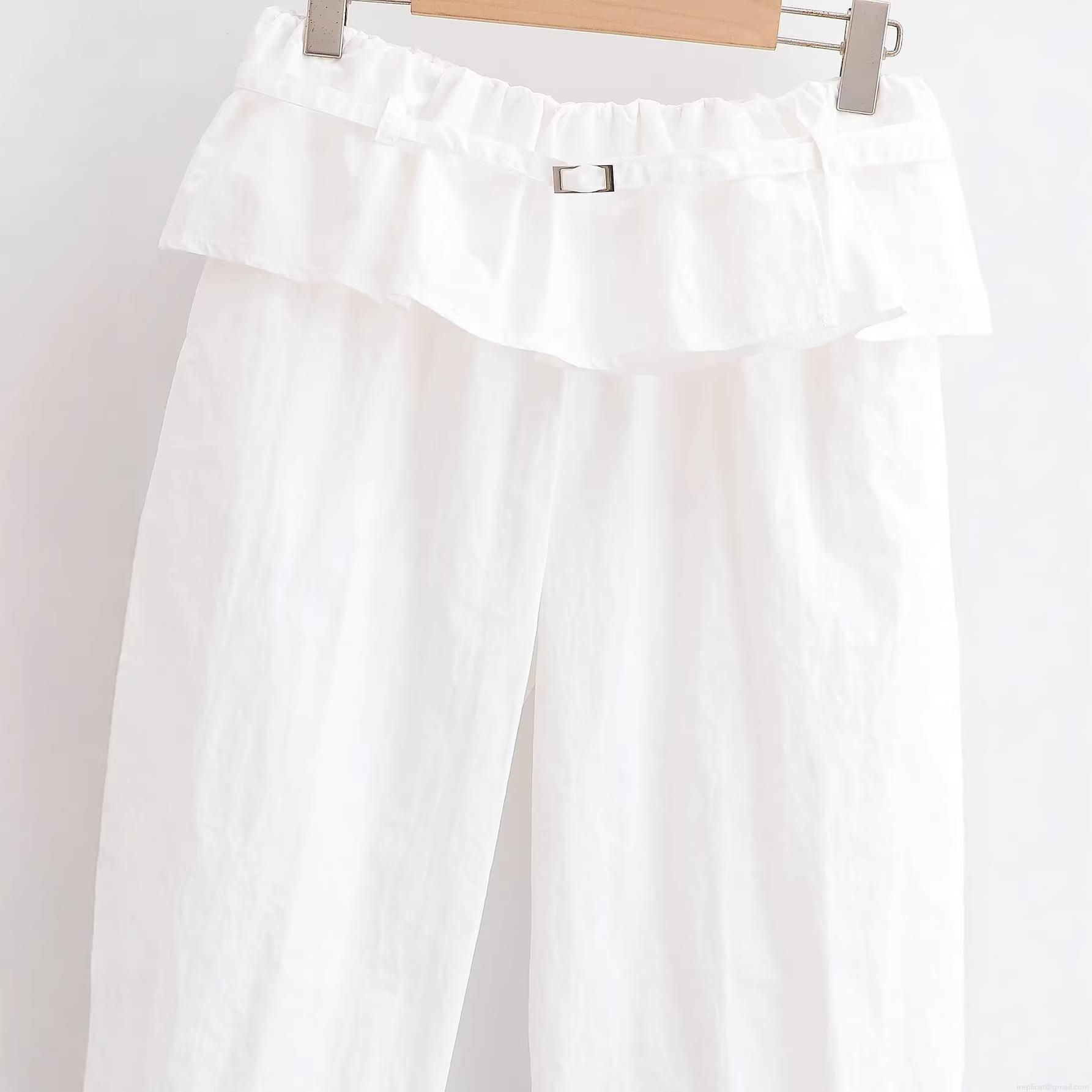 Women's High Waist Ruffle Wide Leg Pants Elegant White Polyester Trousers With Metal Buckle Casual Straight Loose Long Pants For Office Daily Wear Fashion Bottoms