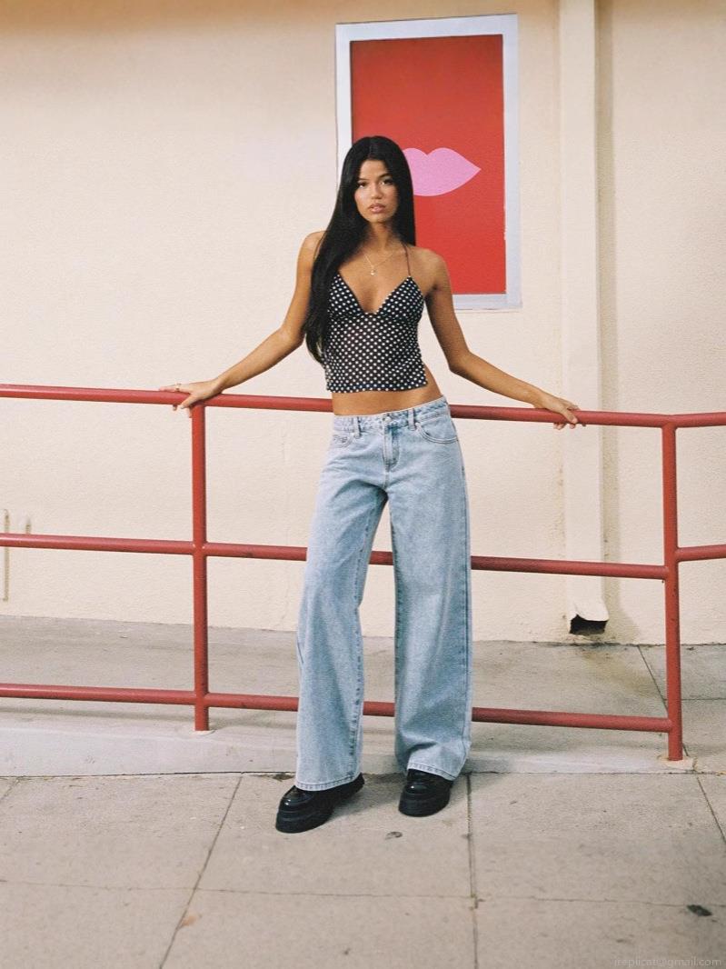 Women Wide Leg Denim Jeans Spliced Contrast Color High Waist Cotton...