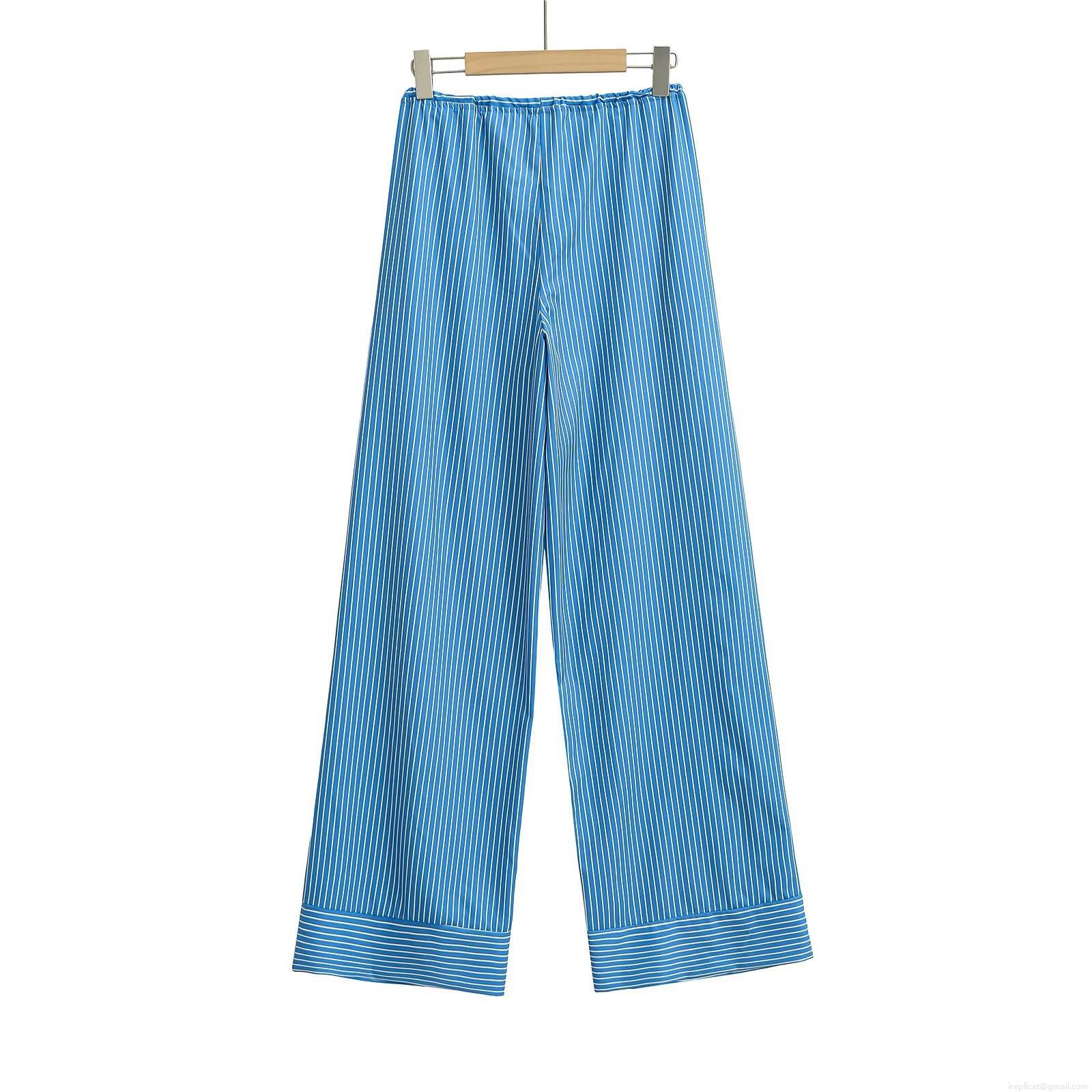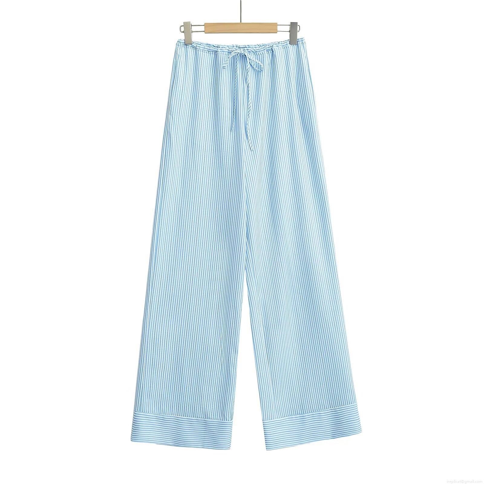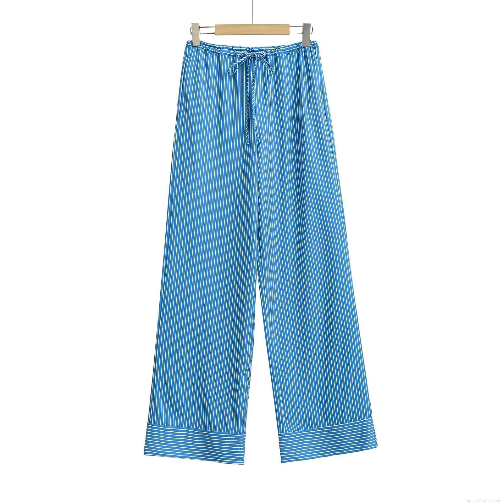 Women's High Waist Striped Wide Leg Pants Comfortable Polyester Drawstring Casual Long Trousers for Daily Streetwear