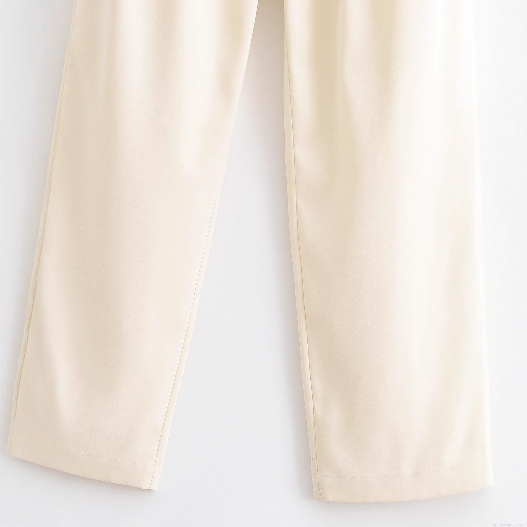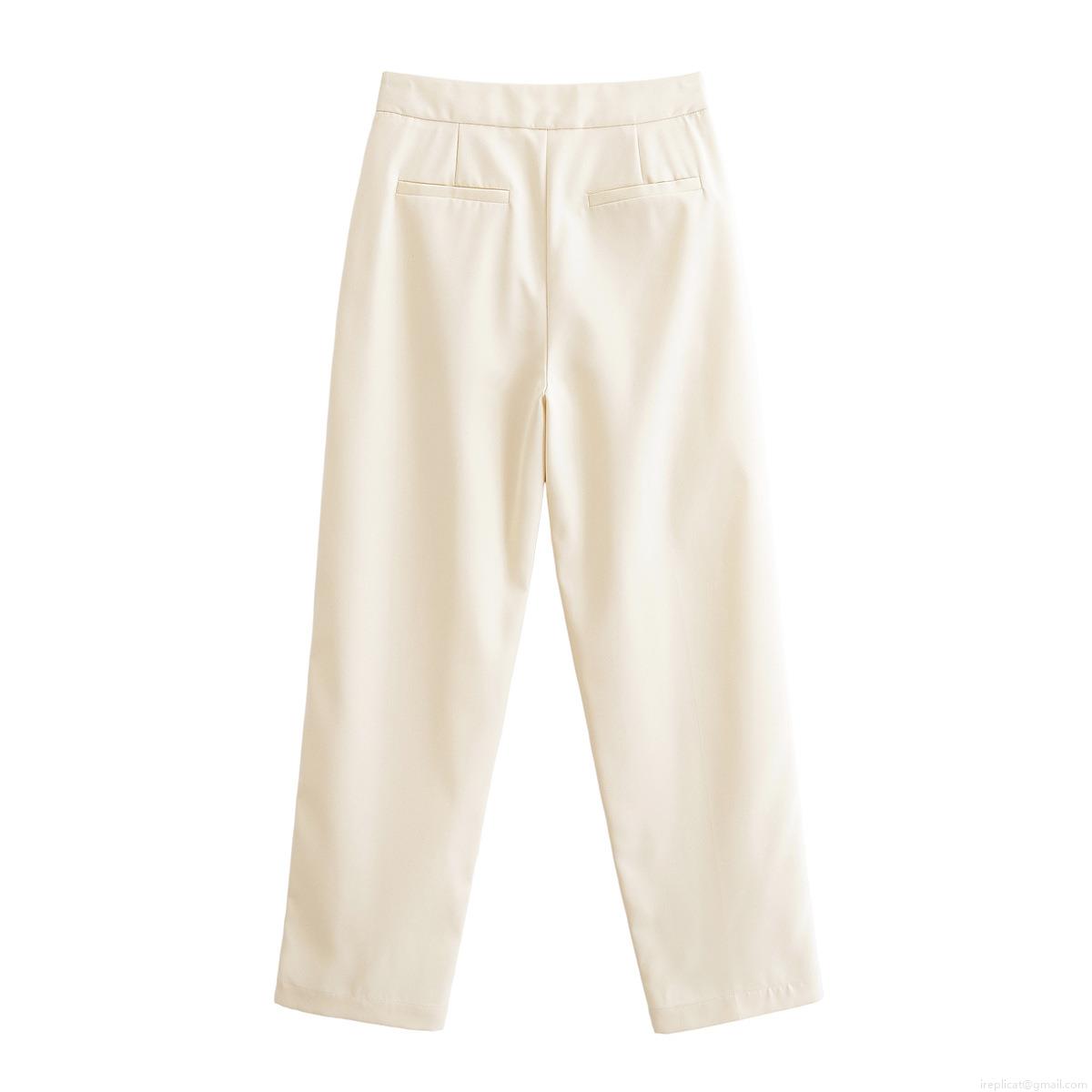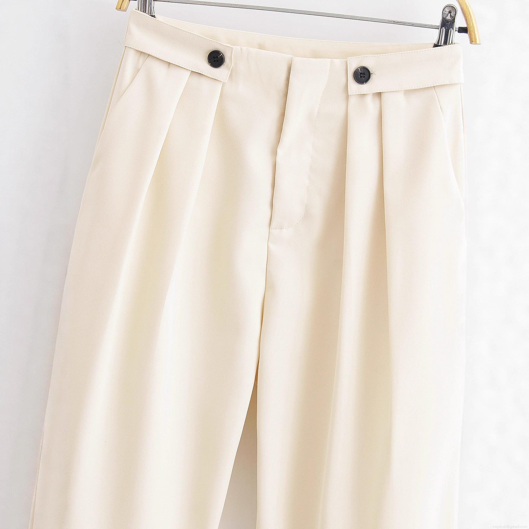 Women's High Waist Wide Leg Casual Pants Button Decorative Pleated Long Trousers Solid Color Streetwear 100% Polyester Cream White Trousers