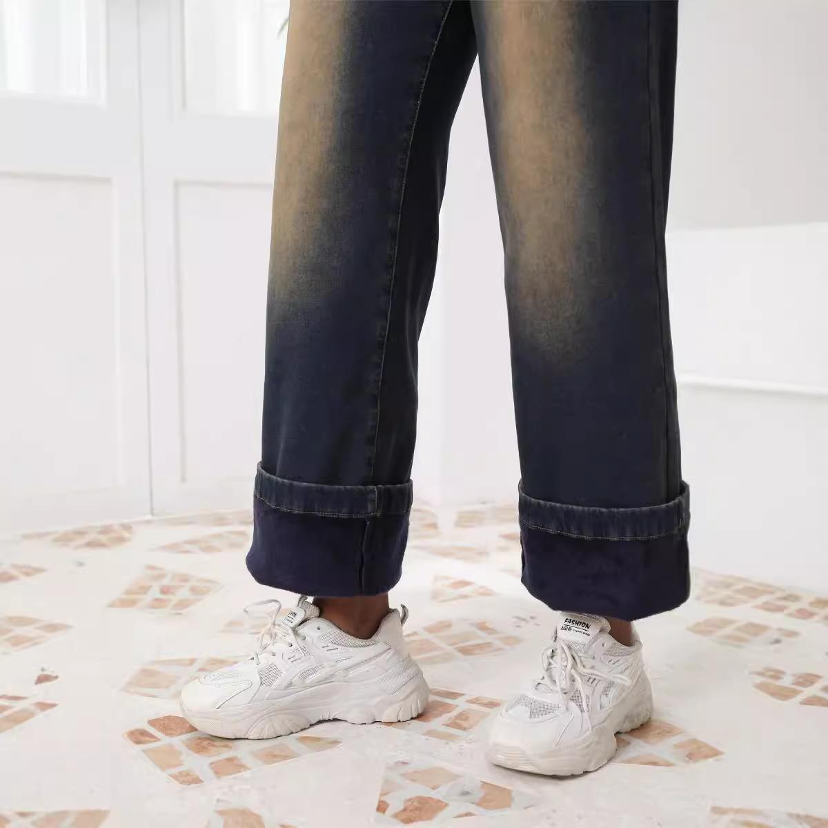 Solid Color, Water Wash, Whitening, Fleece-lined For Warmth, Water Washing Process, High-waisted Design, Wide-leg Pants
