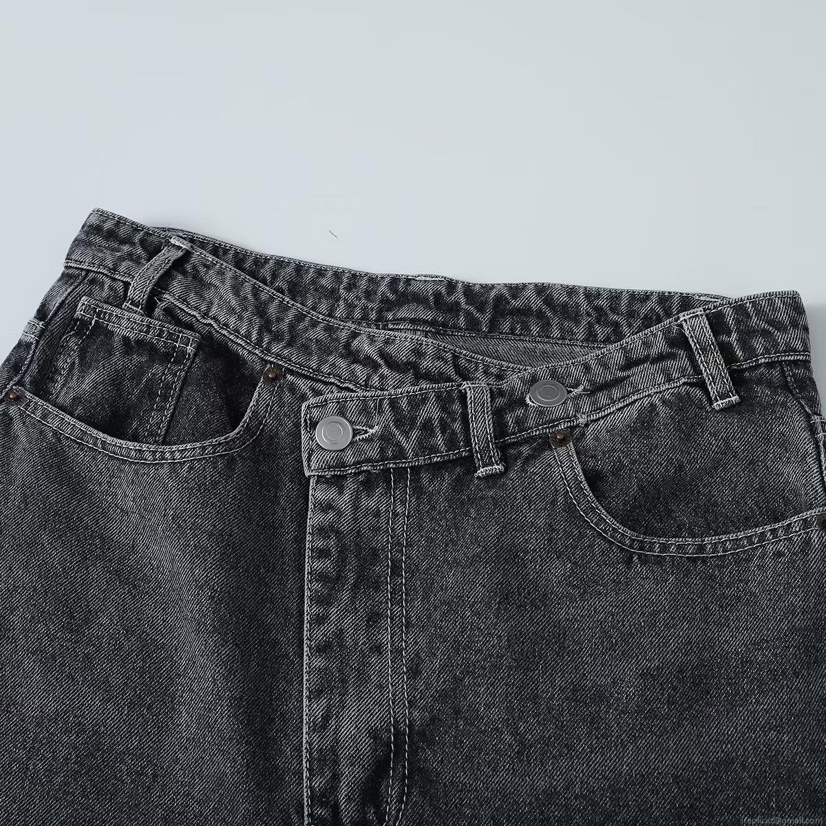 Women's High Waist Wide Leg Jeans Fashion Asymmetrical Cross Over Button Washed Cotton Denim Straight Loose Fit Casual Trousers for Women