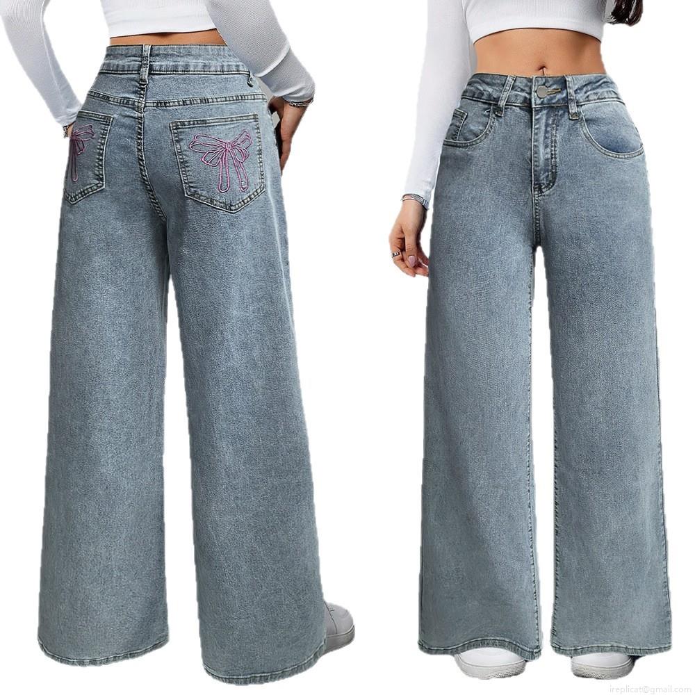 Women's High Waist Wide Leg Jeans Pink Bow Embroidery Washed Denim Pants Loose Streetwear Retro American Fashion Straight Leg Trousers