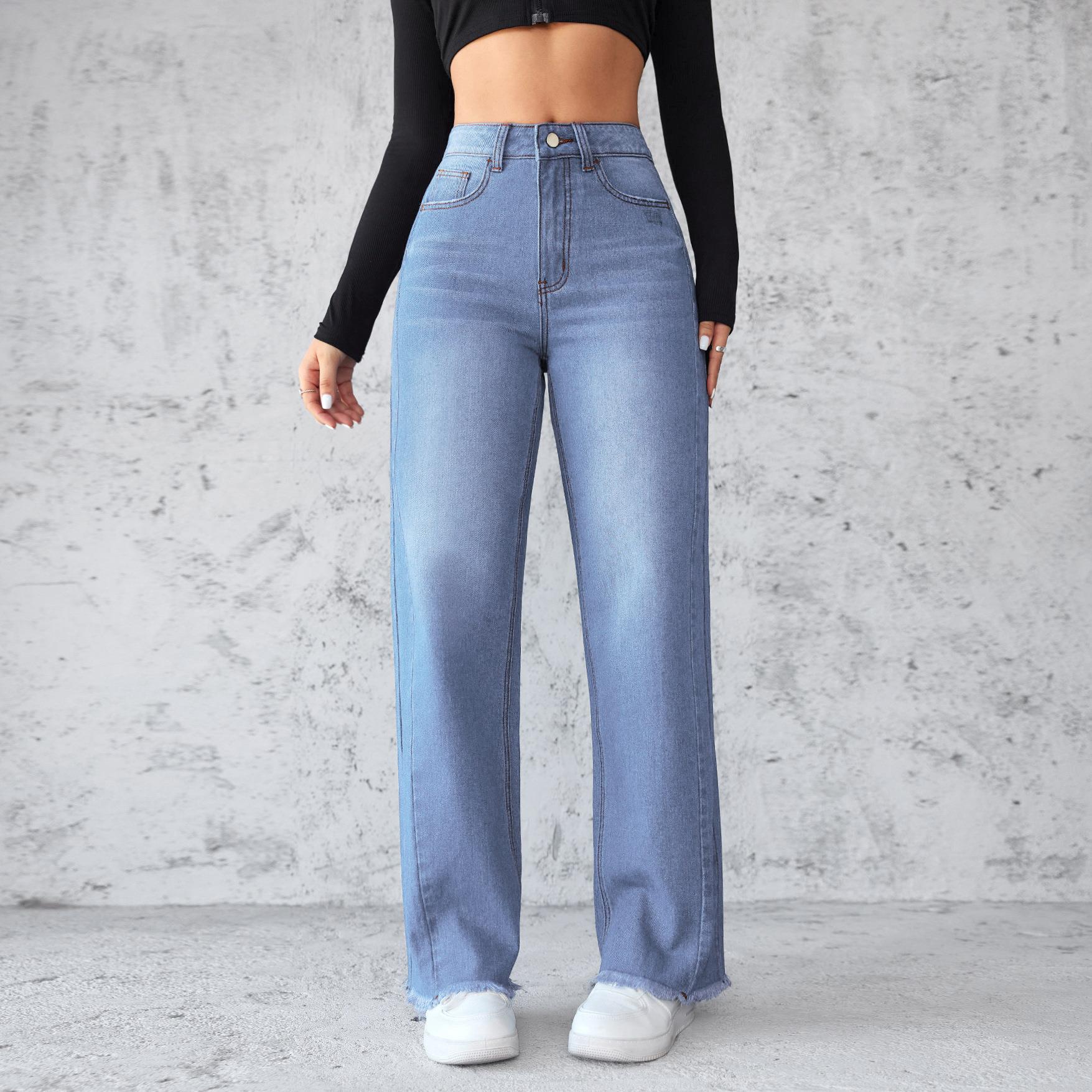 Women's High Waist Wide Leg Jeans Washed Denim Pants With Frayed Hem Streetwear Straight Leg Trousers For Women Cotton Blend Denim Clothing