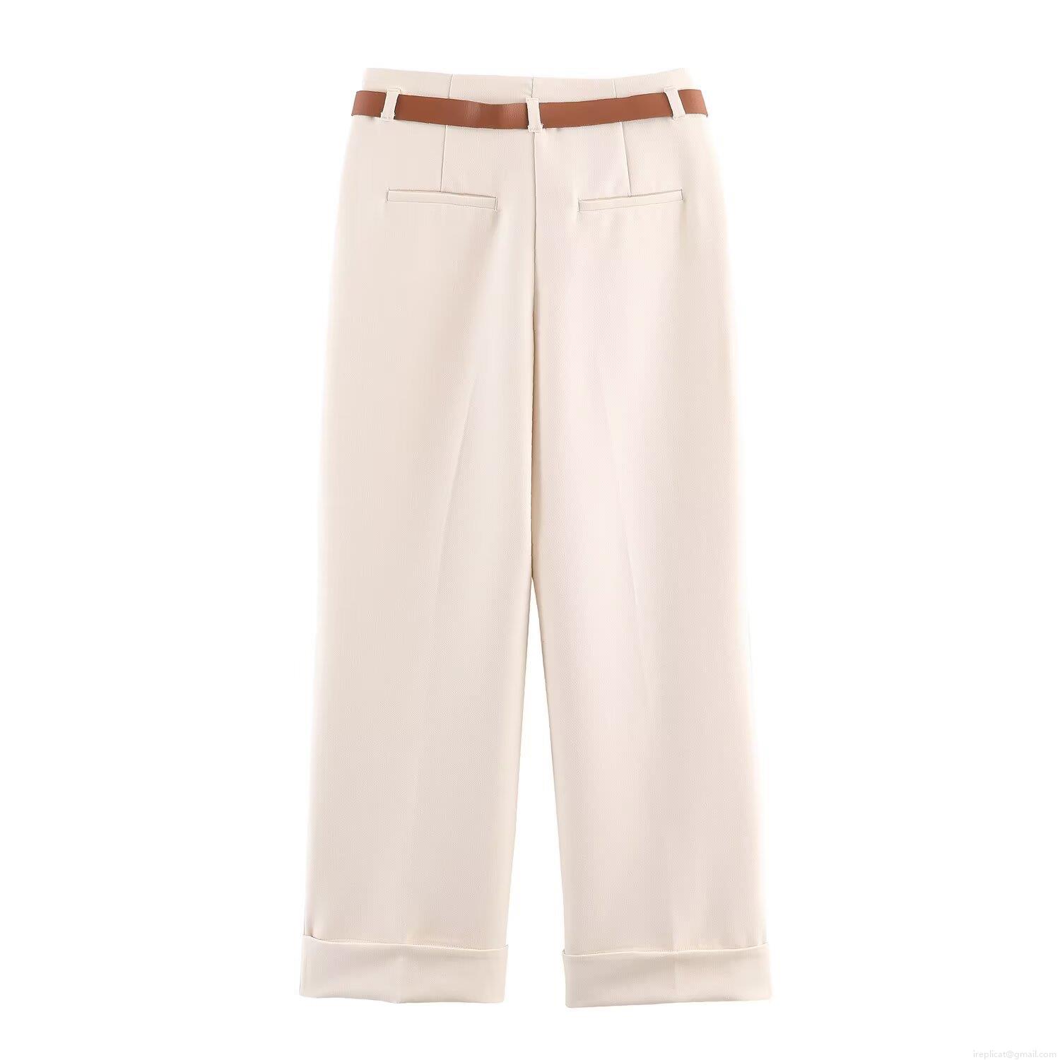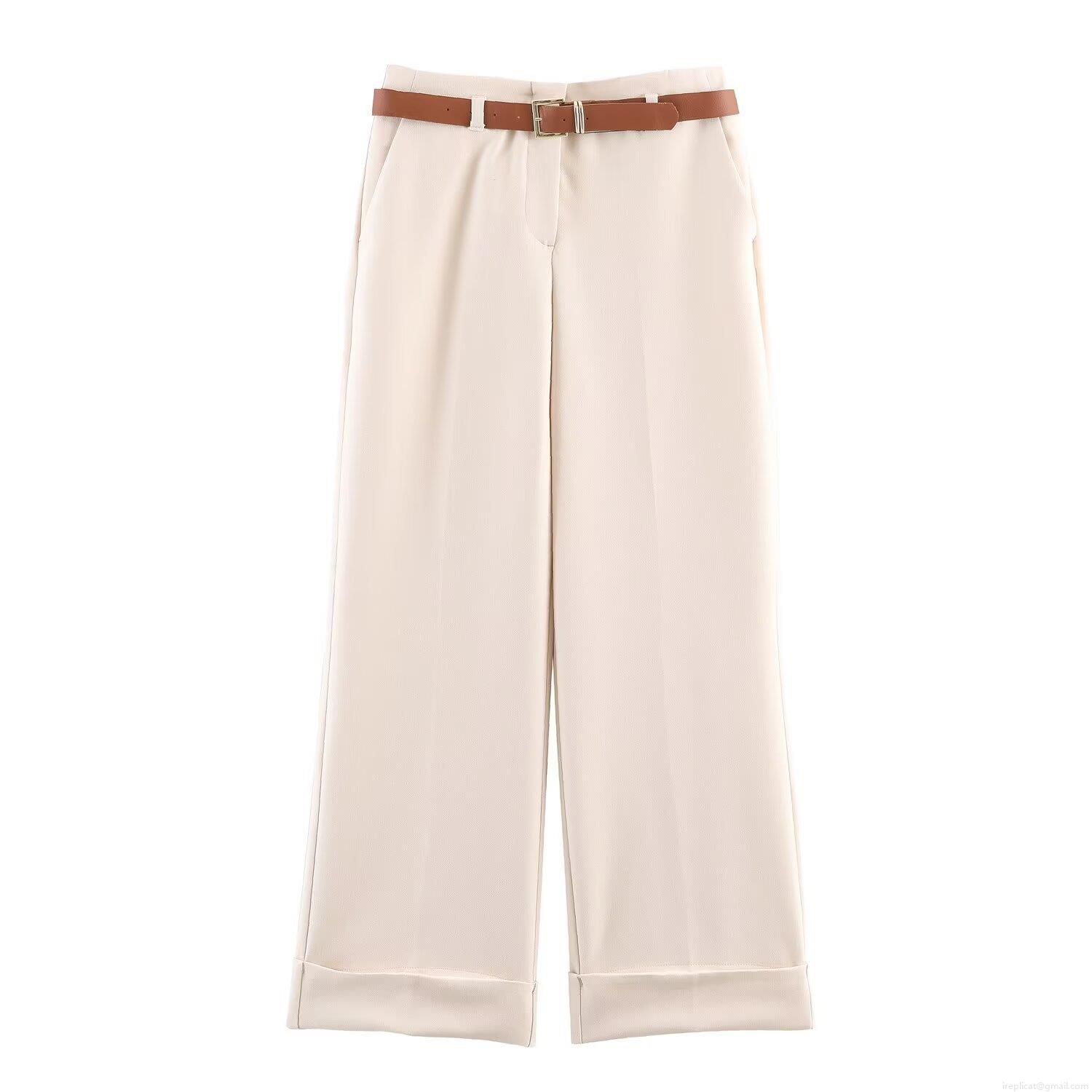 Women's High Waist Wide Leg Pants Casual Cuffed Hem Trousers With Belt Polyester Cotton Blend Minimalist Fashion Long Trousers