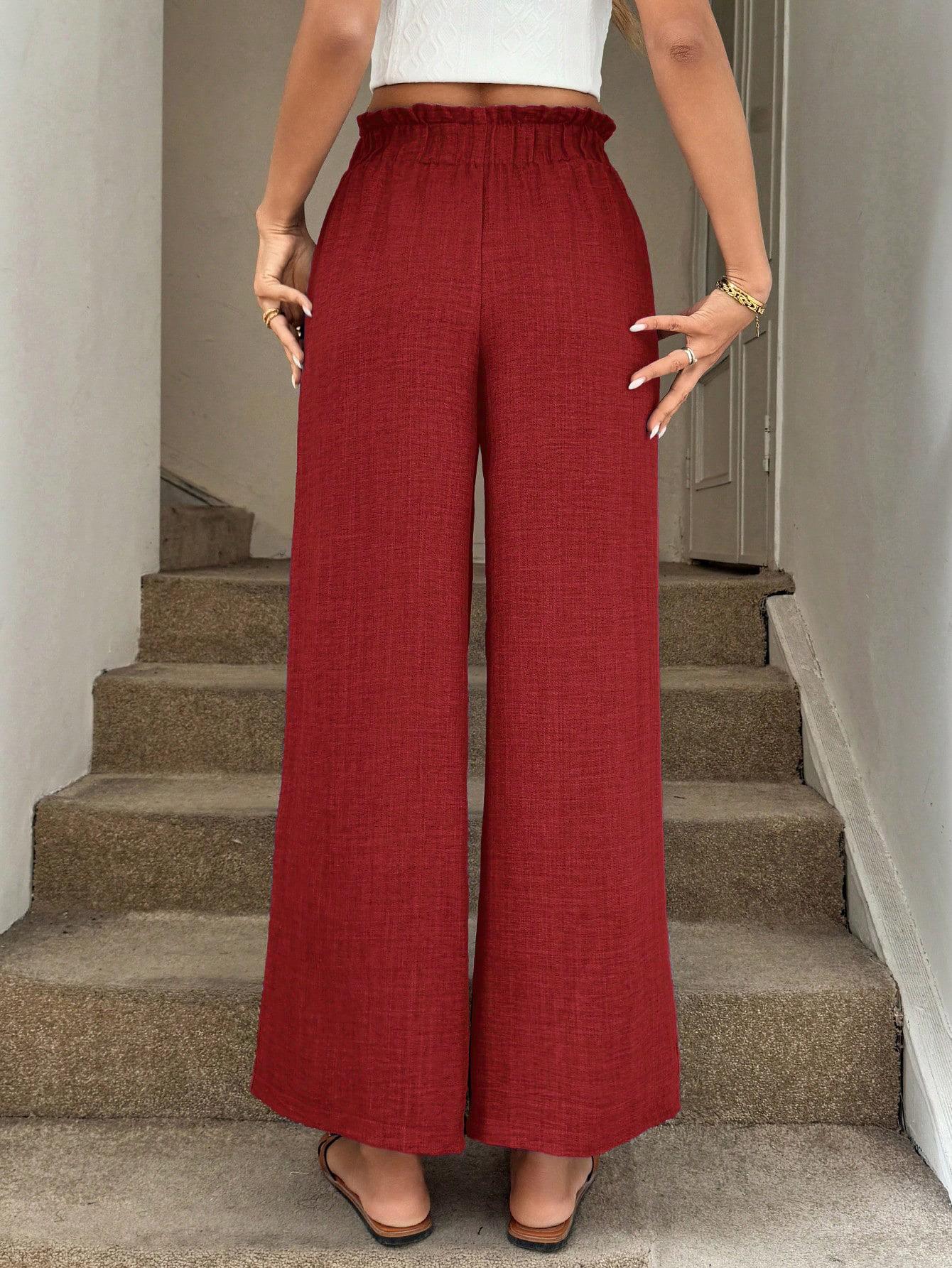 Solid Color, Pleats, Lace, Elastic Waistband, Wide-leg, High-waisted