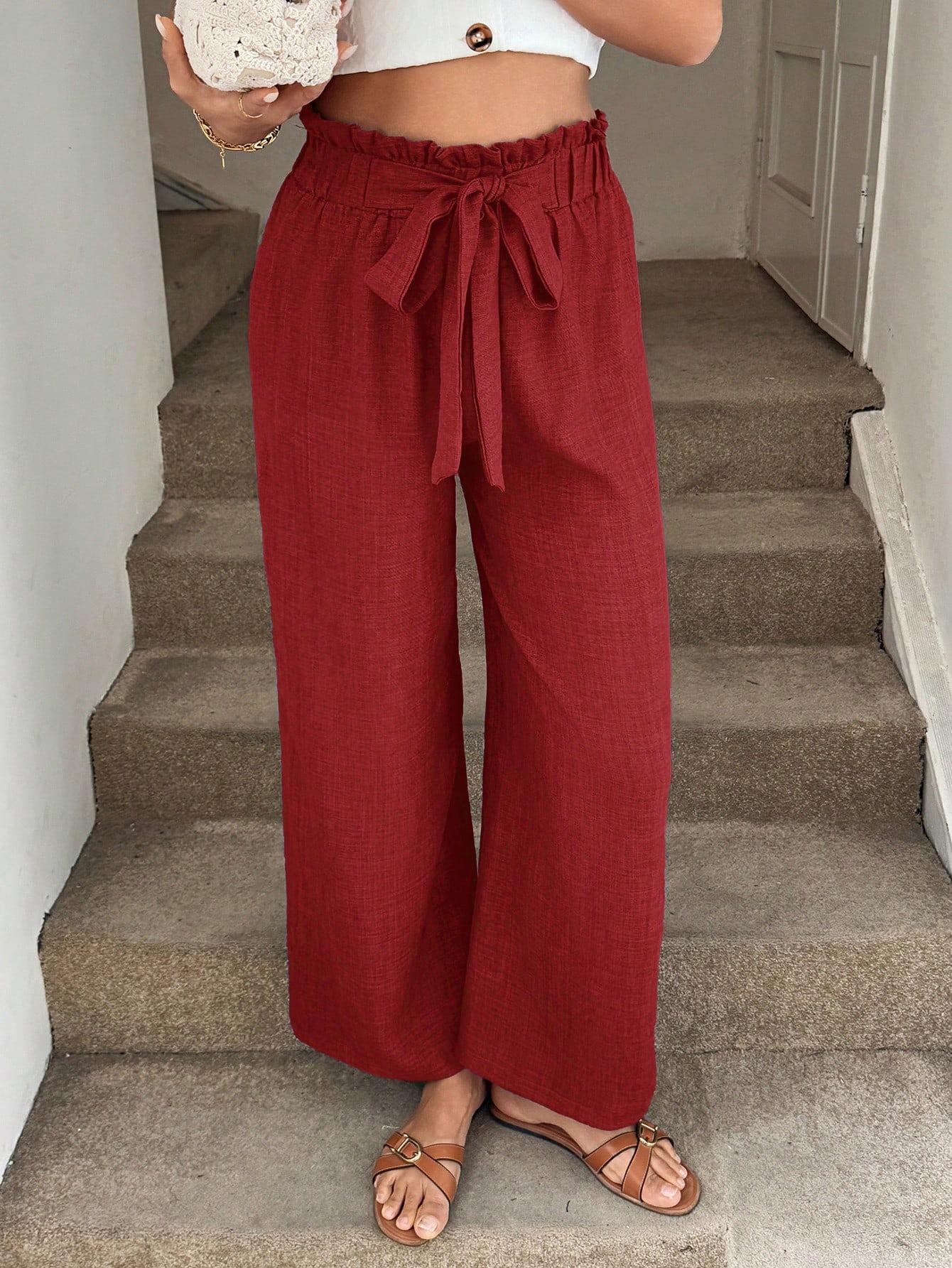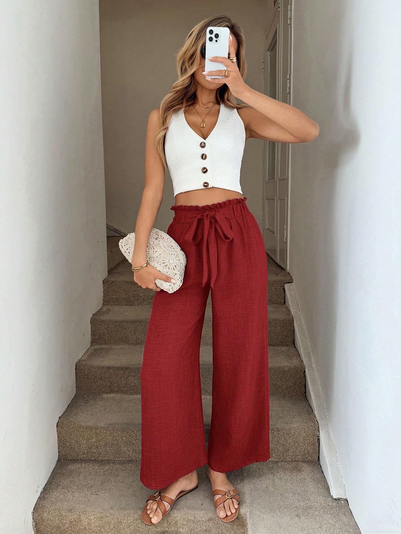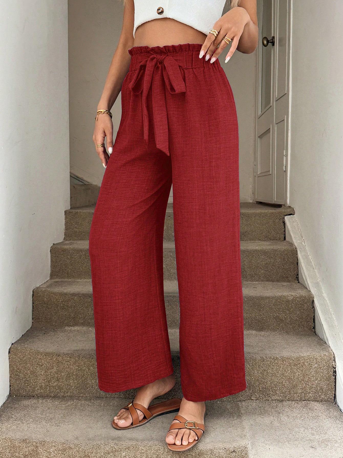 Women's High Waist Wide Leg Pants Polyester Blend Linen Texture Tie Front Elastic Waist Casual Loose Drape Trousers for Vacation Beach Summer Daily