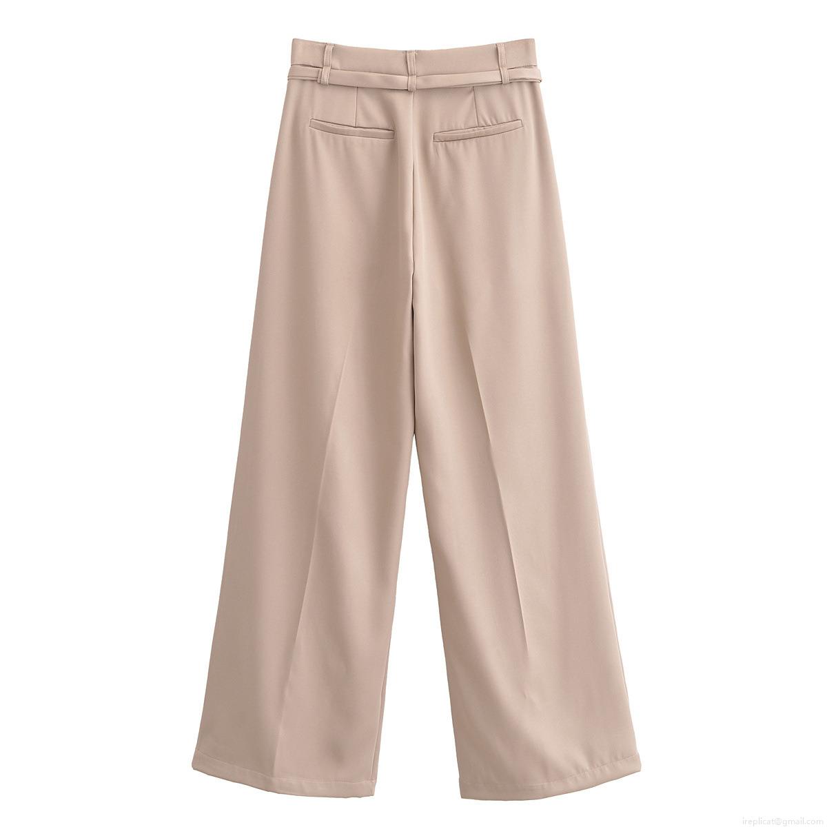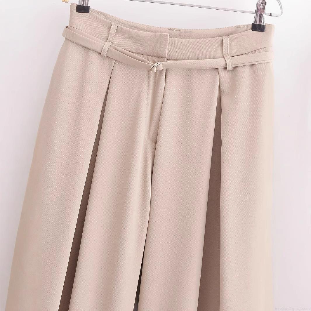 Women's High Waist Wide Leg Pants With Belt Summer Elegant Solid Beige Polyester Trousers Casual Office Streetwear Loose Fit Long Pants
