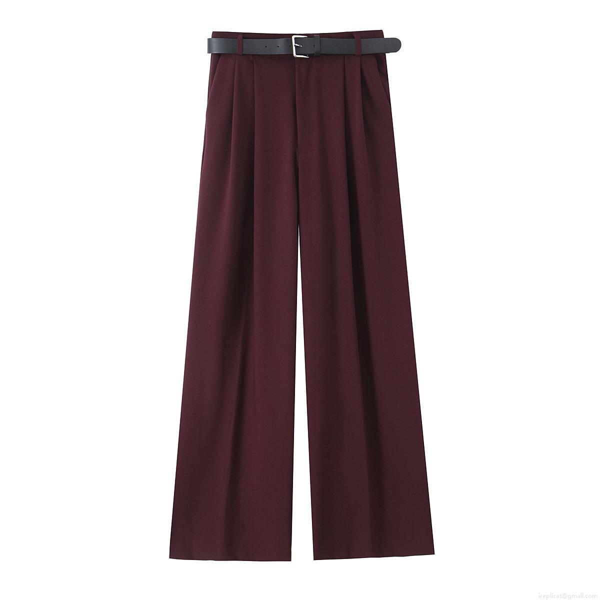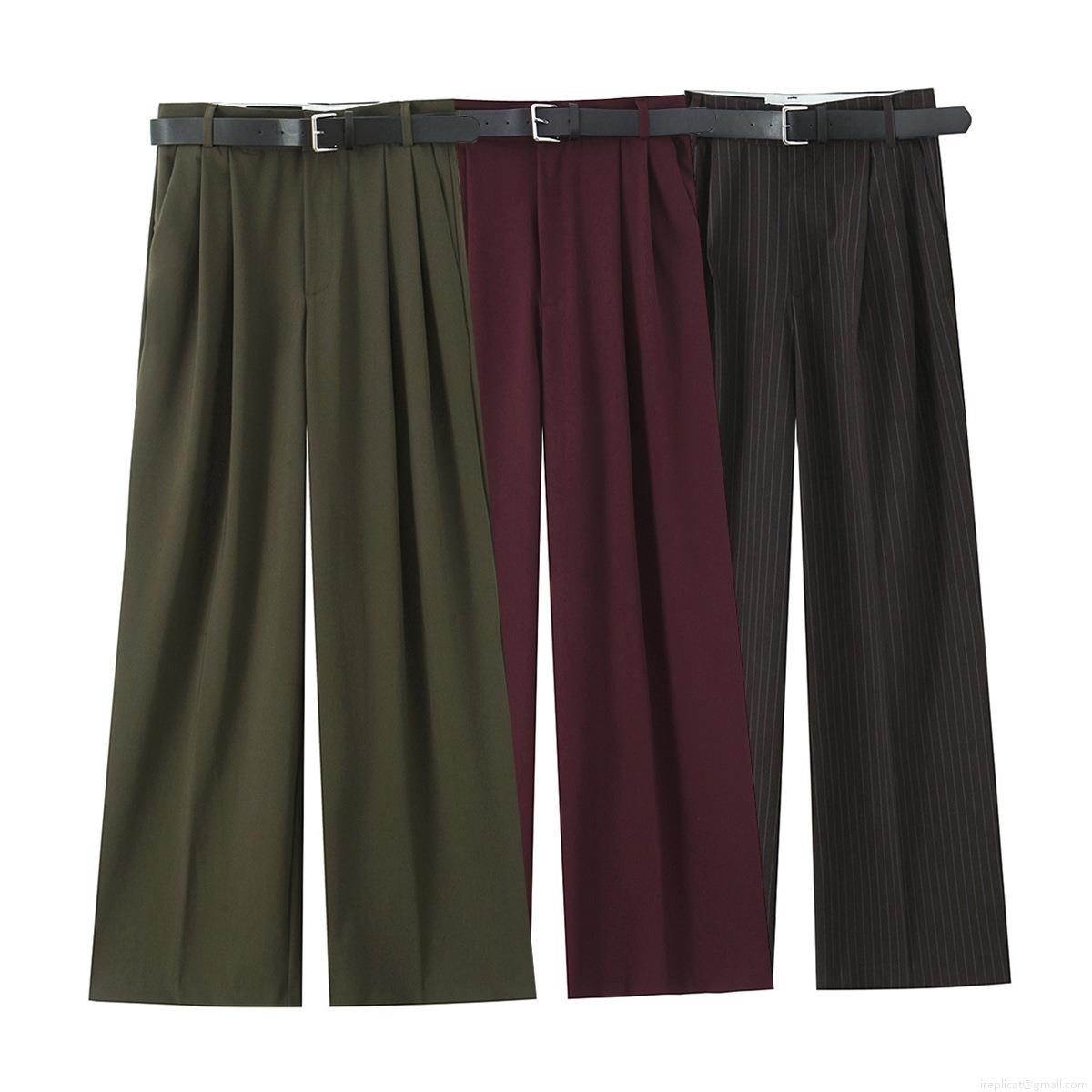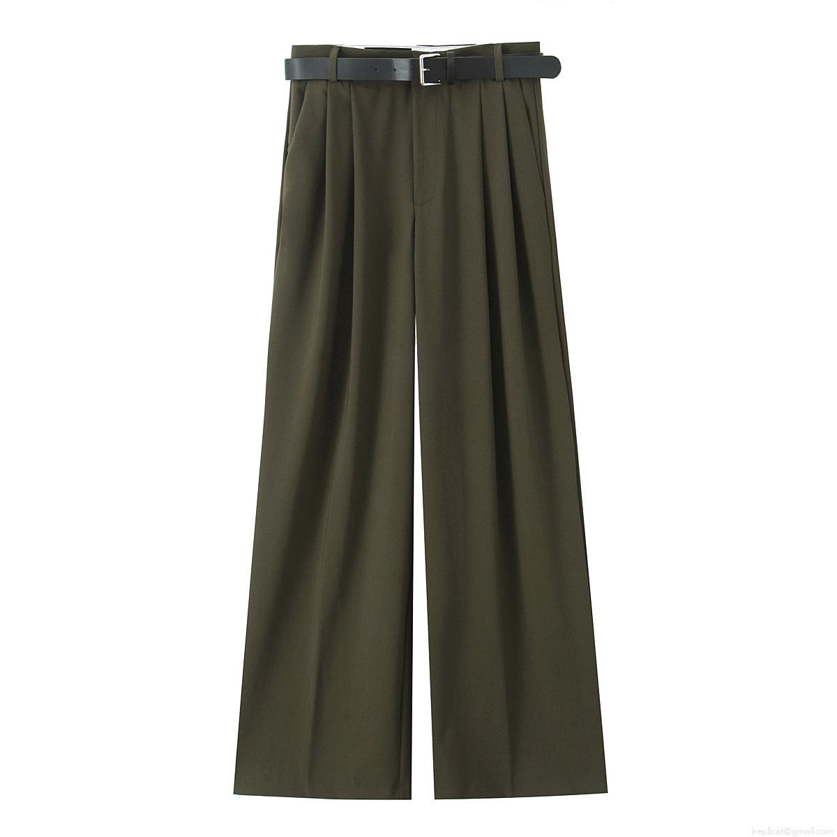 Women's High Waist Wide Leg Straight Casual Pants With Belt Double Pleat Polyester Long Trousers For Office Commute Streetwear Fashion