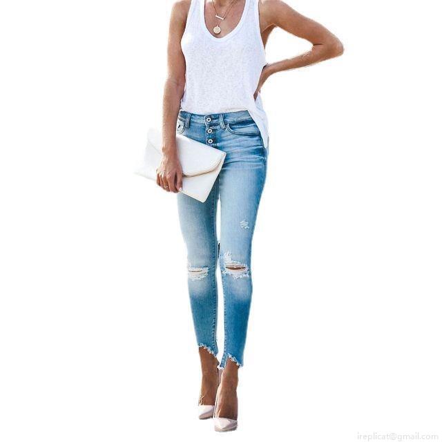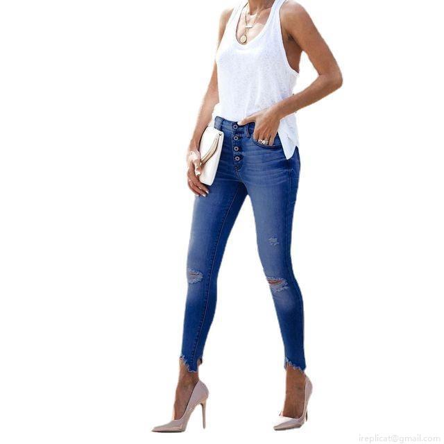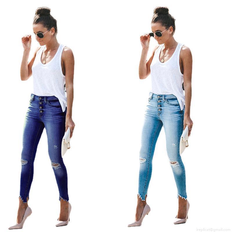 Women's High Waisted Button Fly Ripped Skinny Jeans Distressed Slim Fit Denim Pants With Raw Hem For Fashion Streetwear