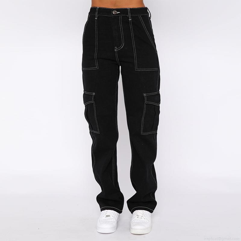 Women's High Waisted Cargo Jeans Loose Wide Leg Denim Pants Streetwear Multi Pocket Contrast Stitching Casual Straight Trousers For Lady Women