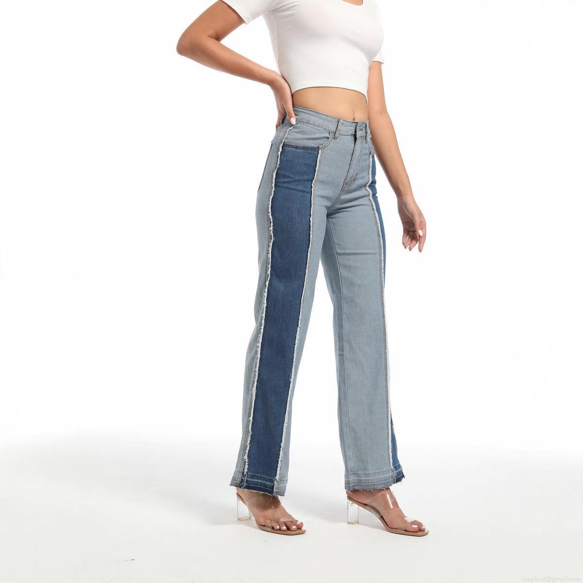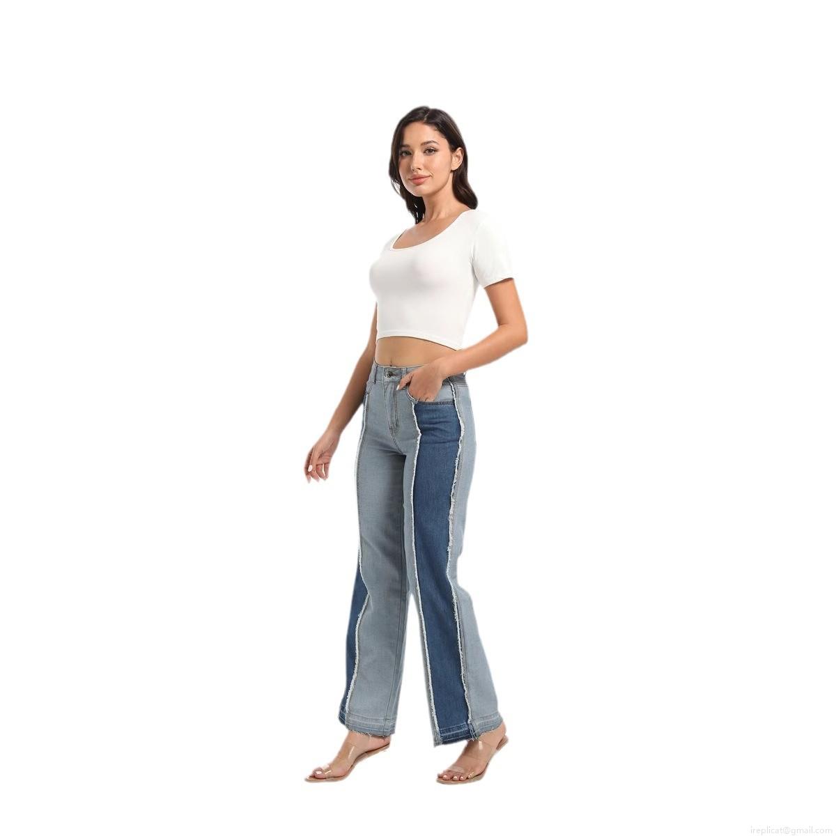 Women's High Waisted Color Block Patchwork Straight Leg Jeans Stretchy Cotton Blend Denim Pants With Raw Hem Raw Edge Long Trousers Streetwear Casual For Ladies