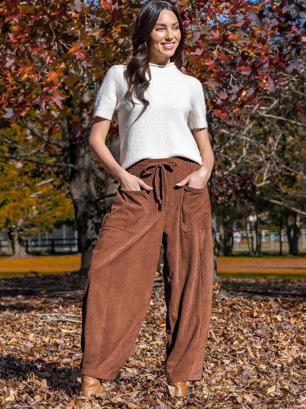 Women's High Waisted Corduroy Wide Leg Pants Casual Loose Drawstring Trousers with Large Pockets Solid Color Straight Leg Pants