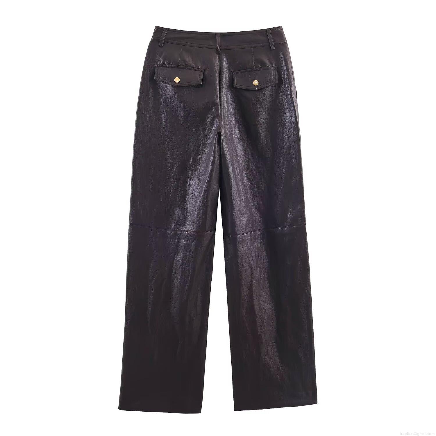 Women's High Waisted Faux Leather Straight Leg Pants Trendy PU Leather Trousers With Pockets Elegant Casual Long Pants Streetwear For Women