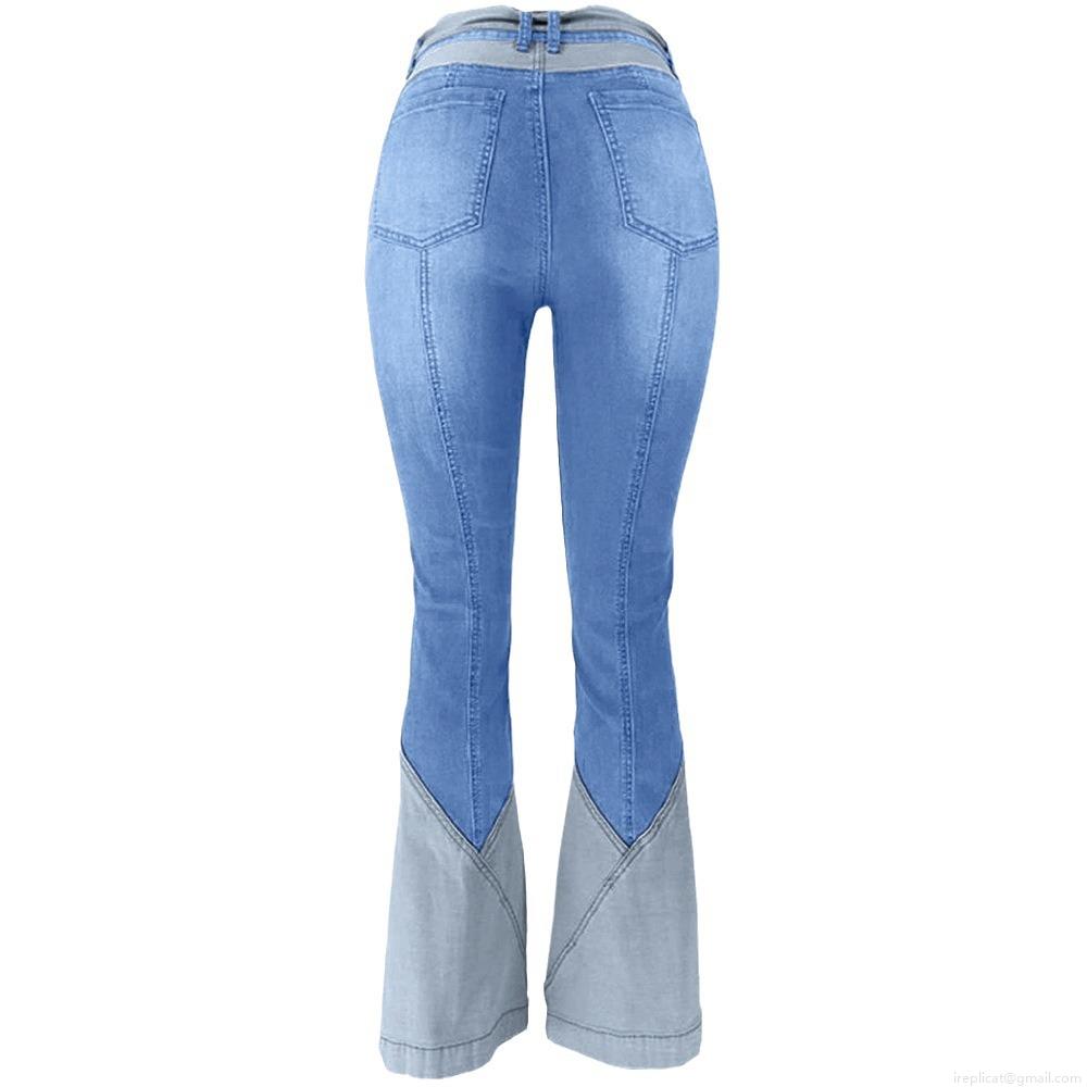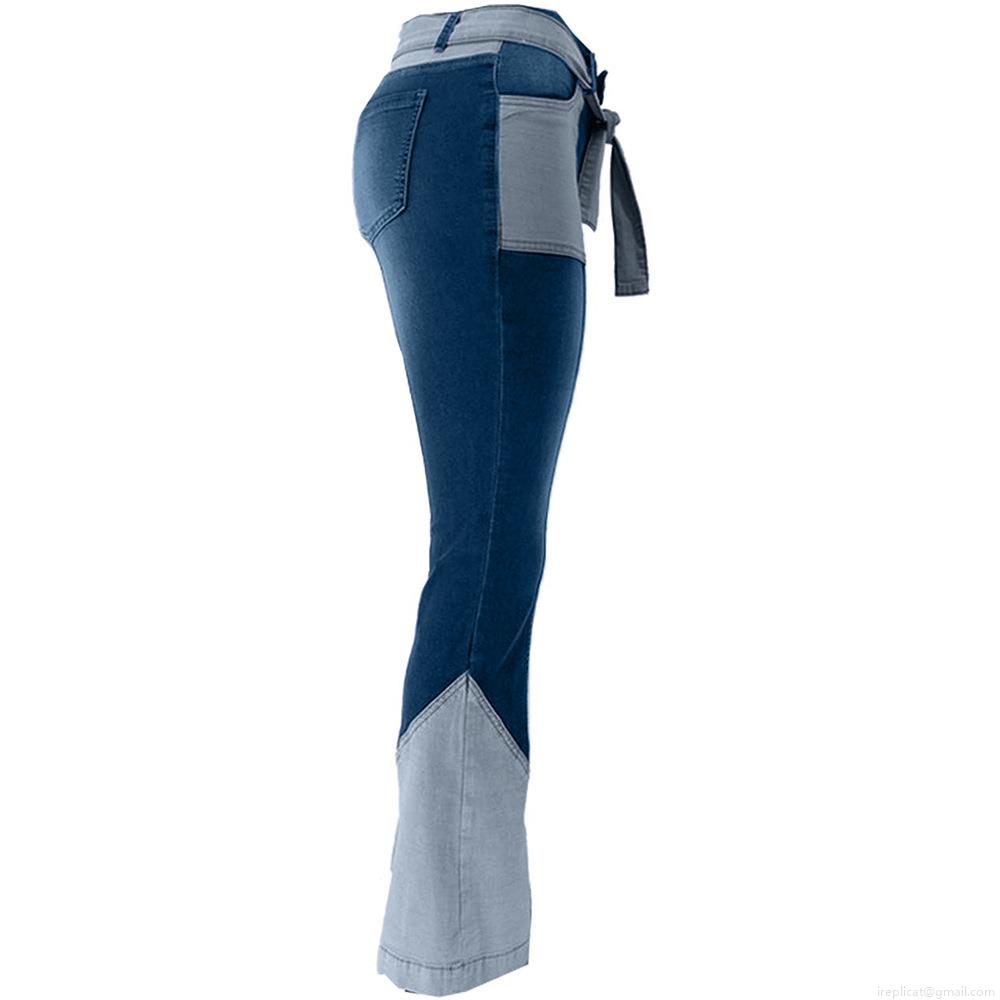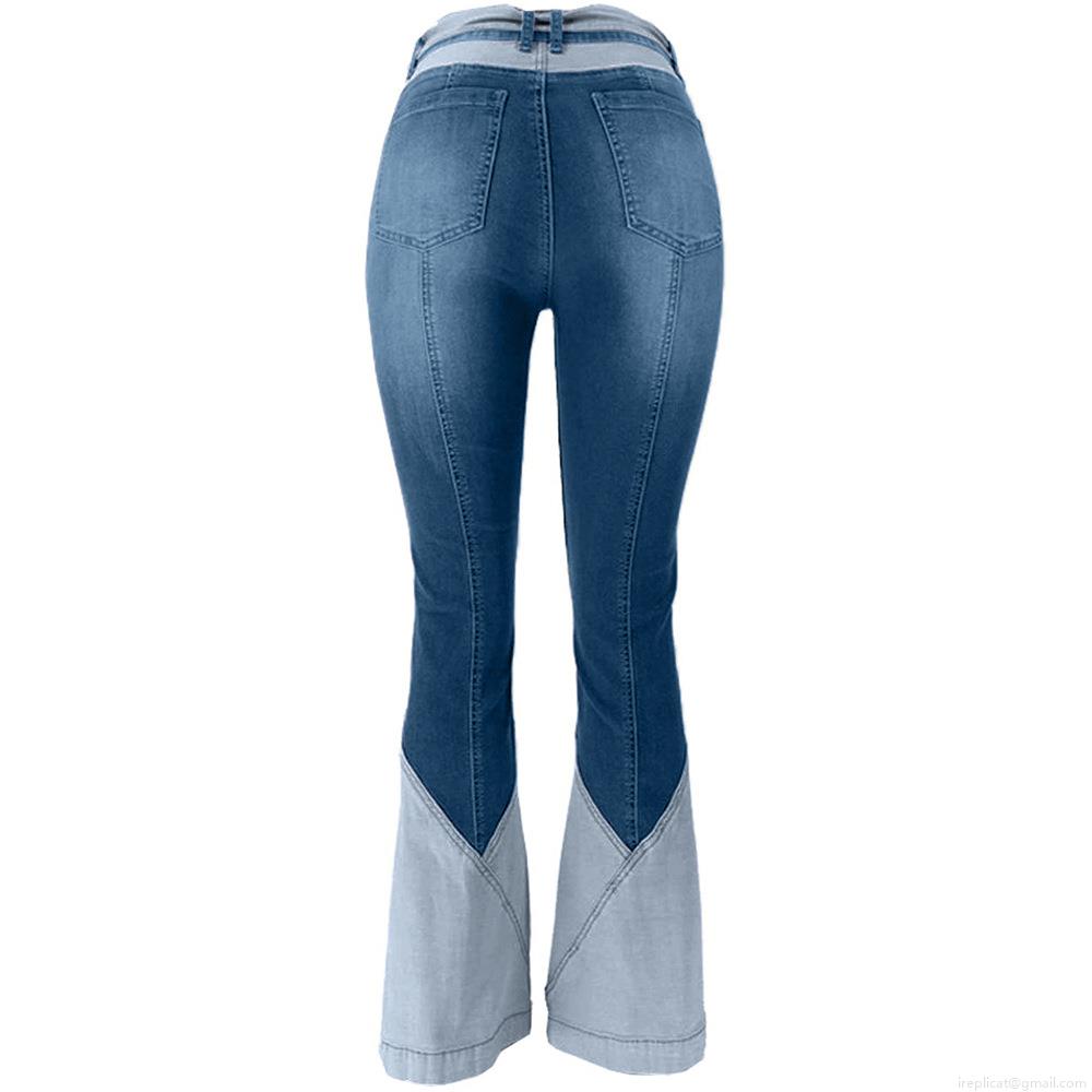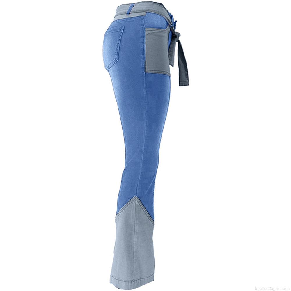 Women's High Waisted Patchwork Flare Jeans Cotton Blend Color Block Denim Bell Bottom Pants With Tie Belt