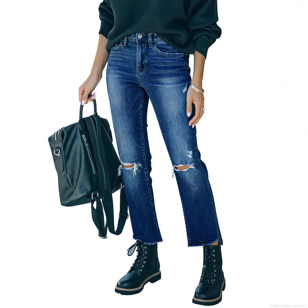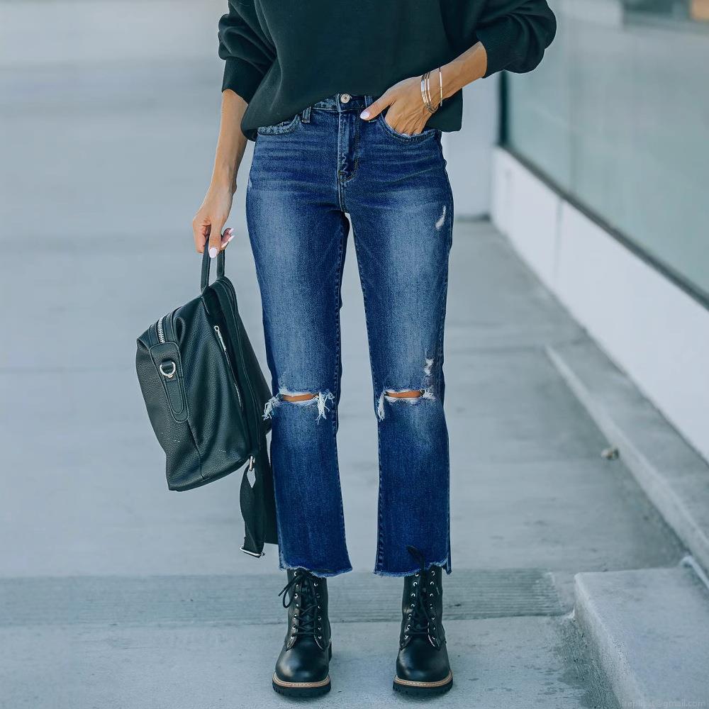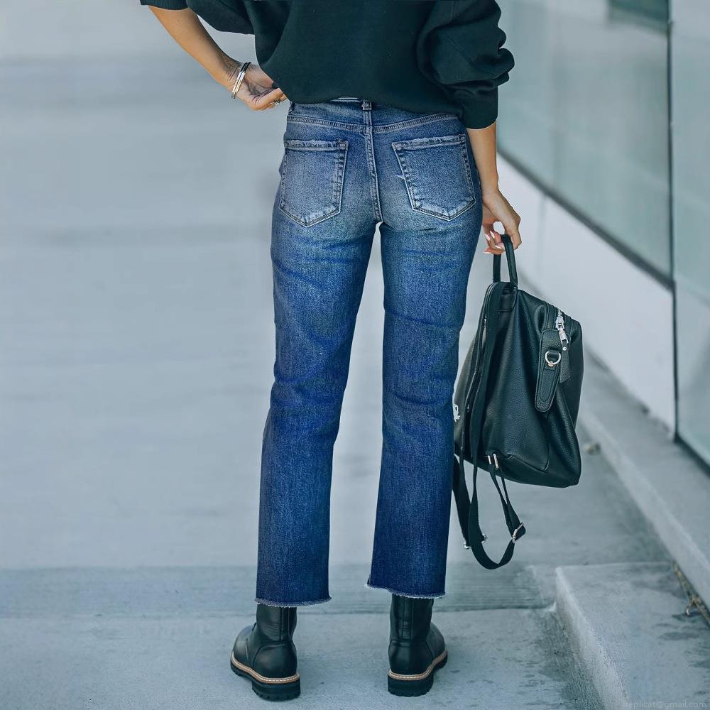 Women's High Waisted Ripped Distressed Jeans Straight Leg Denim Trousers With Raw Hem Washed Cotton Blend Streetwear Casual Pants