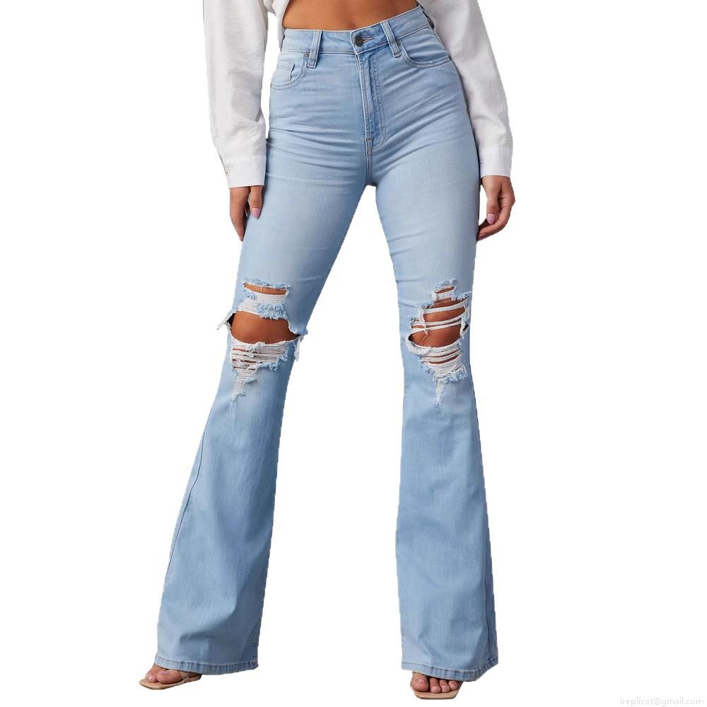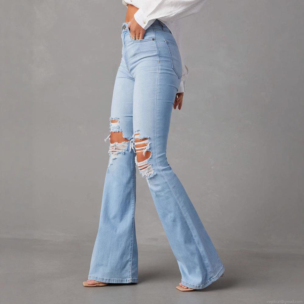 Women's High Waisted Ripped Flare Jeans Distressed Denim Bell Bottom Trousers Streetwear Style Light Blue Long Pants for Ladies
