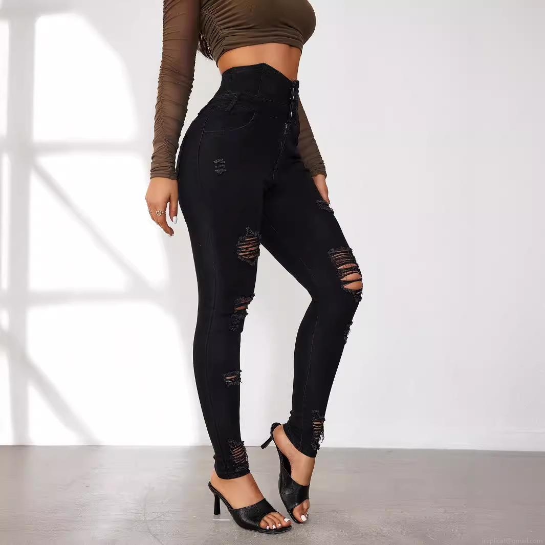 Women's High Waisted Ripped Skinny Jeans Stretchy Distressed Denim Pants With 3 Button Closure Slim Fit Bodycon Blue Trousers For Daily Streetwear