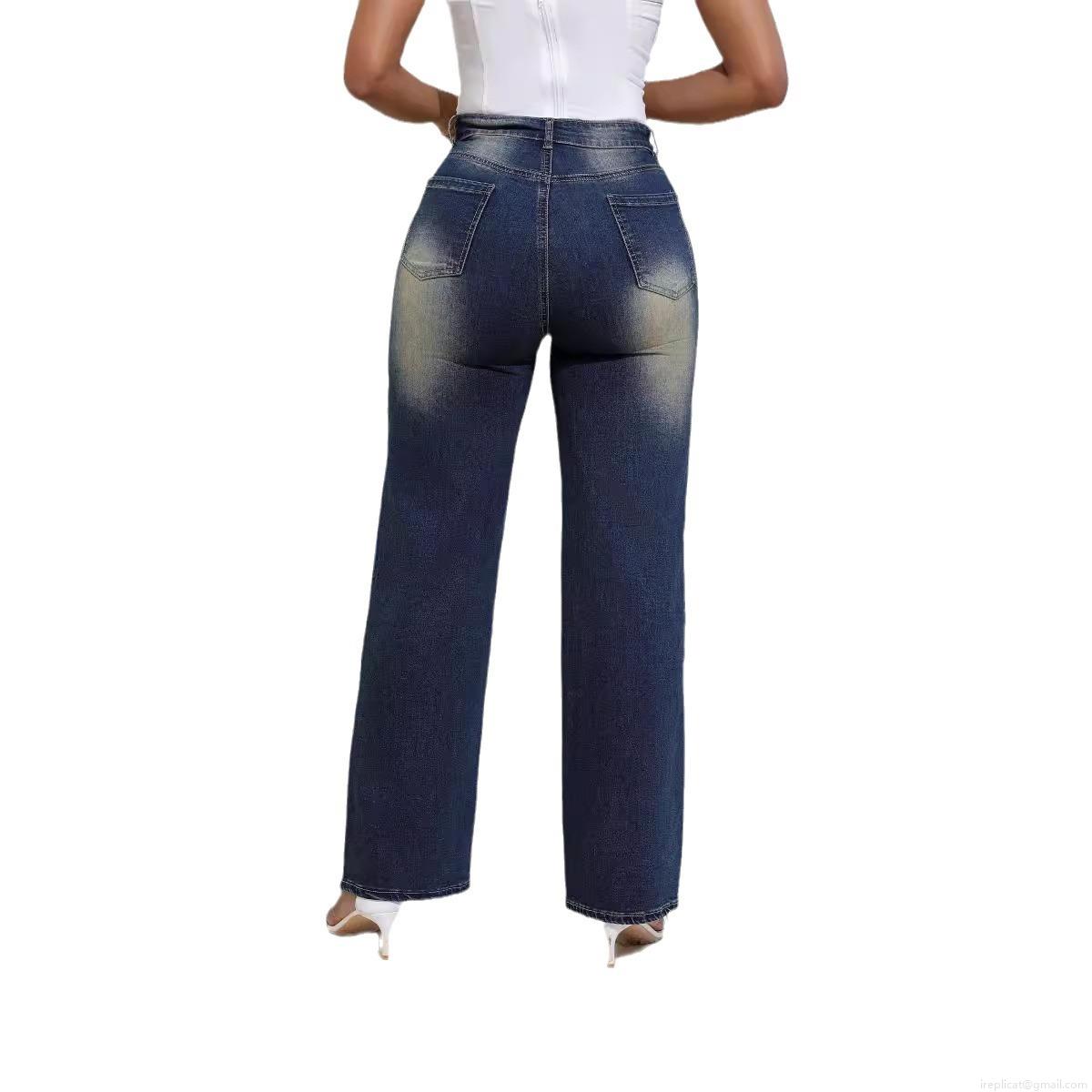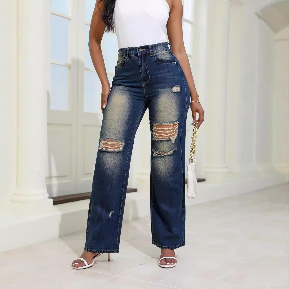 Women's Vintage Distressed Straight Leg Jeans Cotton Denim Trousers...