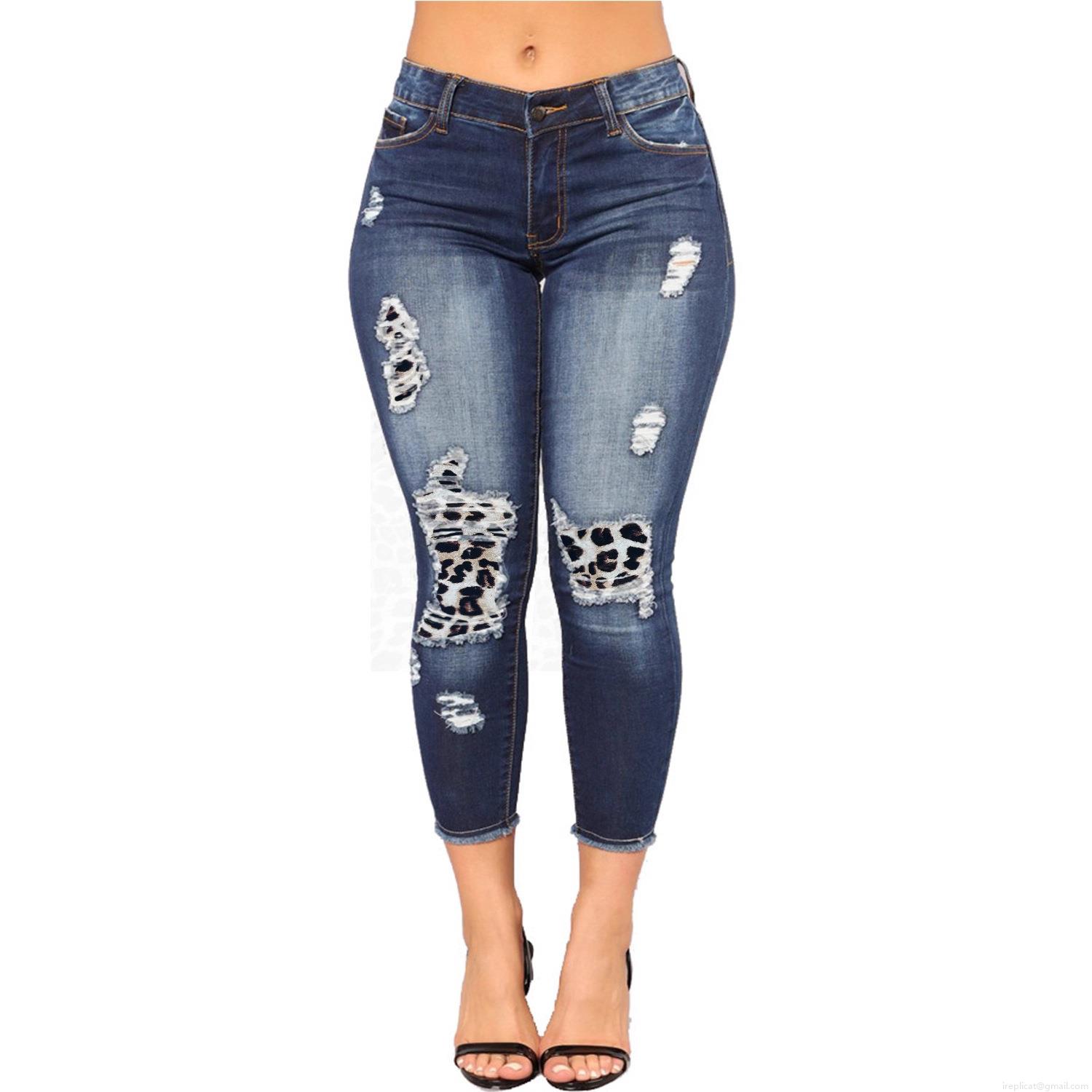 Women's High Waisted Skinny Ripped Jeans Cotton Blend Distressed Denim Cropped Pants With Leopard Print Patchwork Streetwear Slim Fit Jeggings