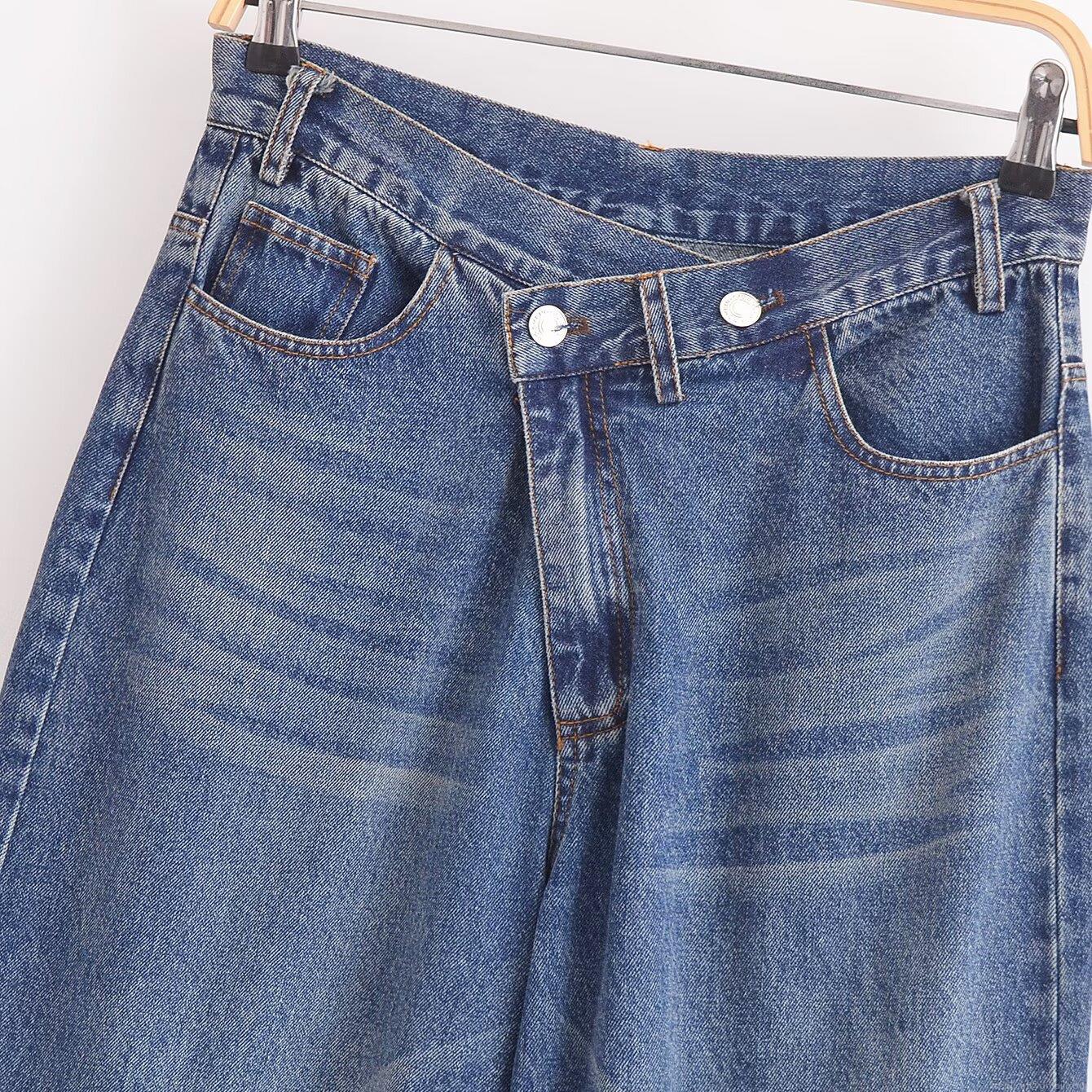 Women's High Waisted Wide Leg Jeans Asymmetrical Criss Cross Double Button Denim Trousers Casual Washed Loose Fit Fashion Long Pants for Women