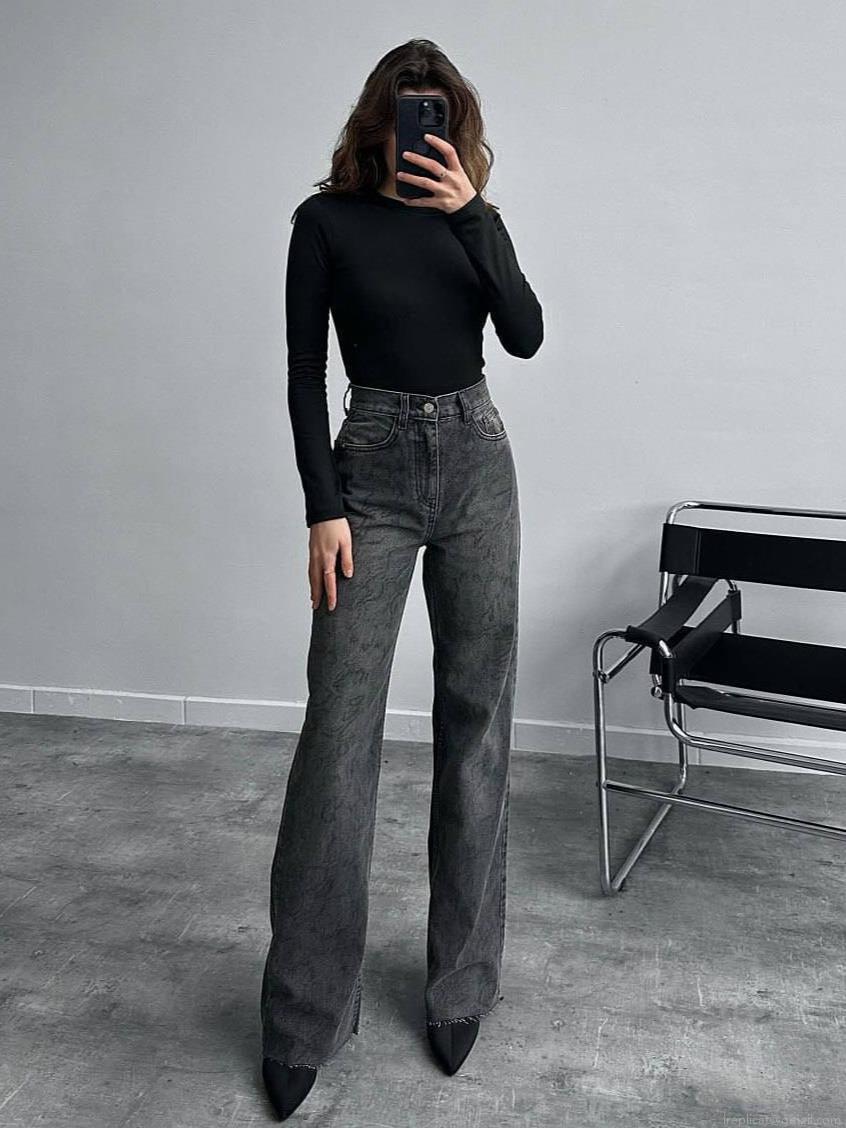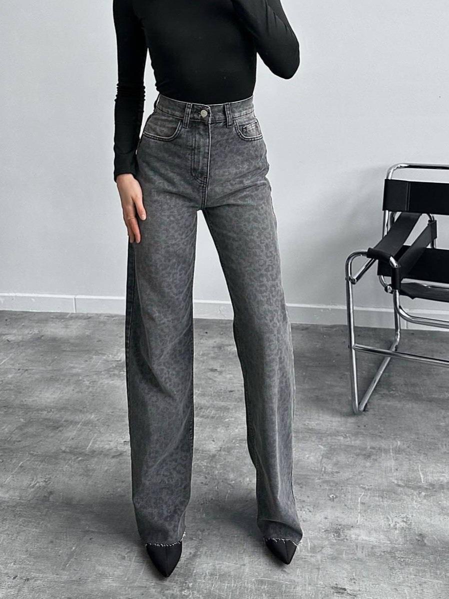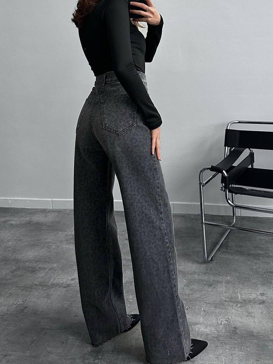 Women's High Waisted Wide Leg Jeans Leopard Print Cotton Blend Straight Denim Pants Streetwear Casual Loose Long Trousers Fashionable Black Gray