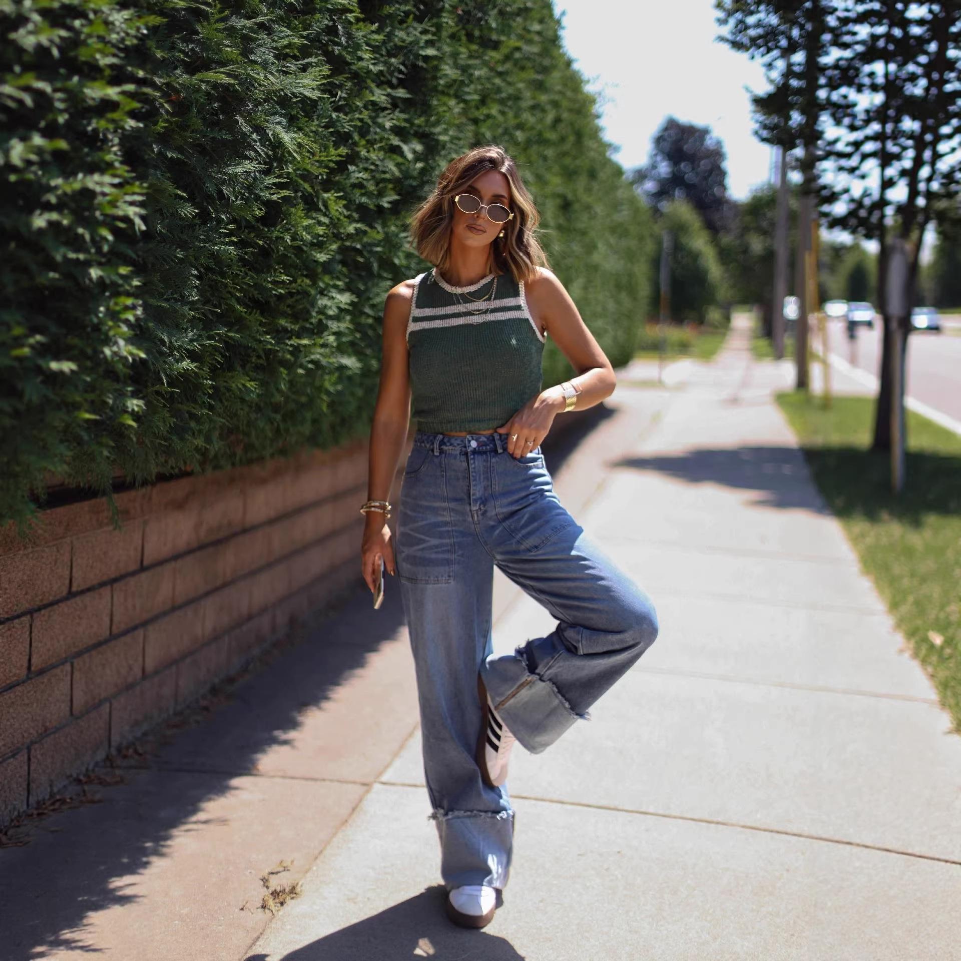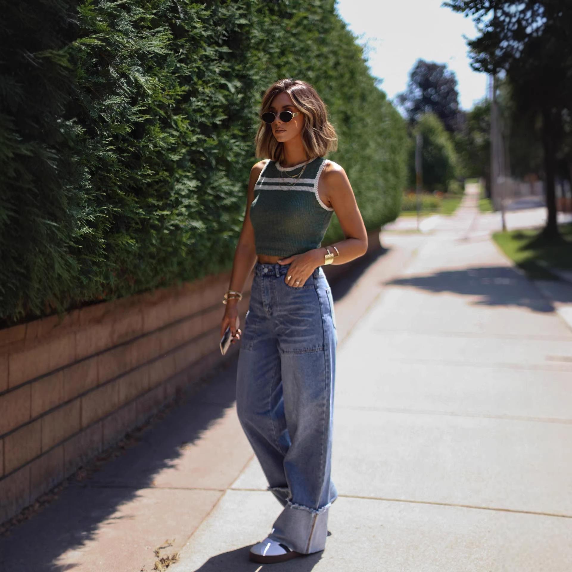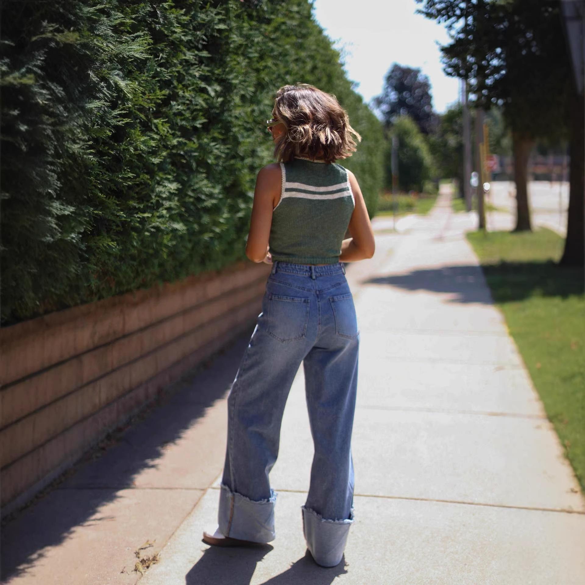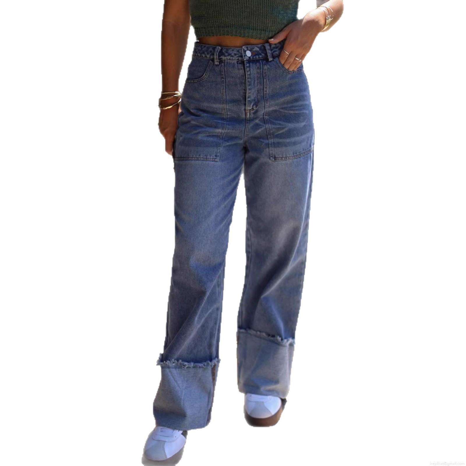 Women's High Waisted Wide Leg Jeans Retro Washed Denim Cotton Blend Cuffed Raw Hem Loose Casual Streetwear Trousers For Daily Street Wear