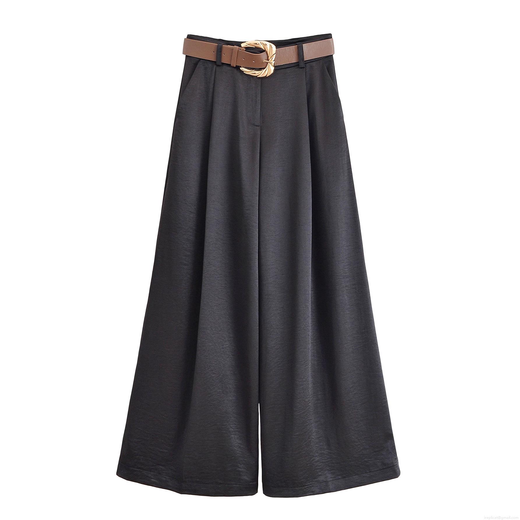 Women's High Waisted Wide Leg Pants With Belt Polyester Fabric Casual Solid Color Leopard Print Long Trousers Autumn Streetwear