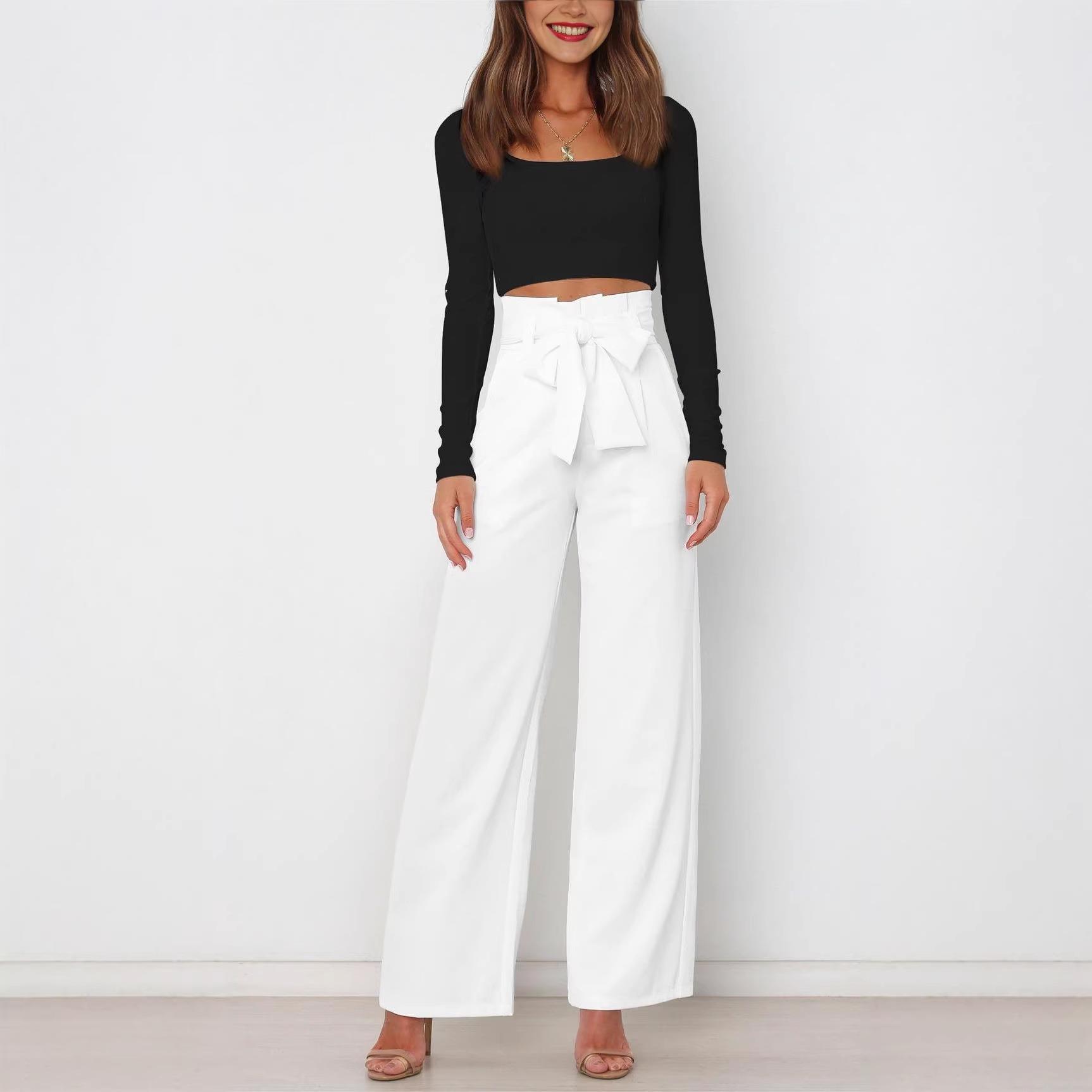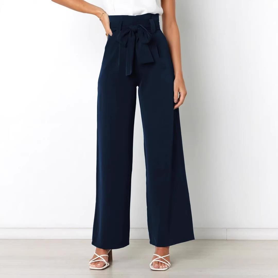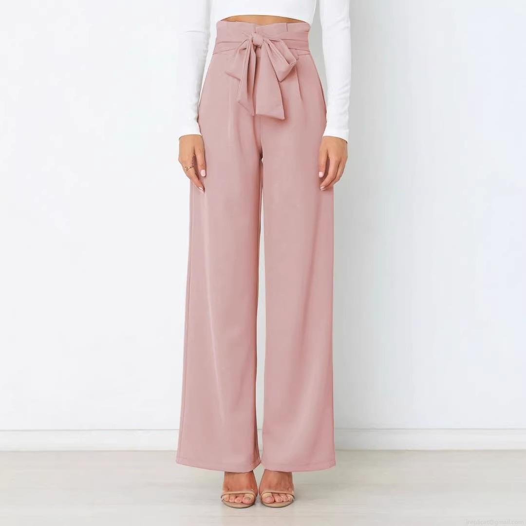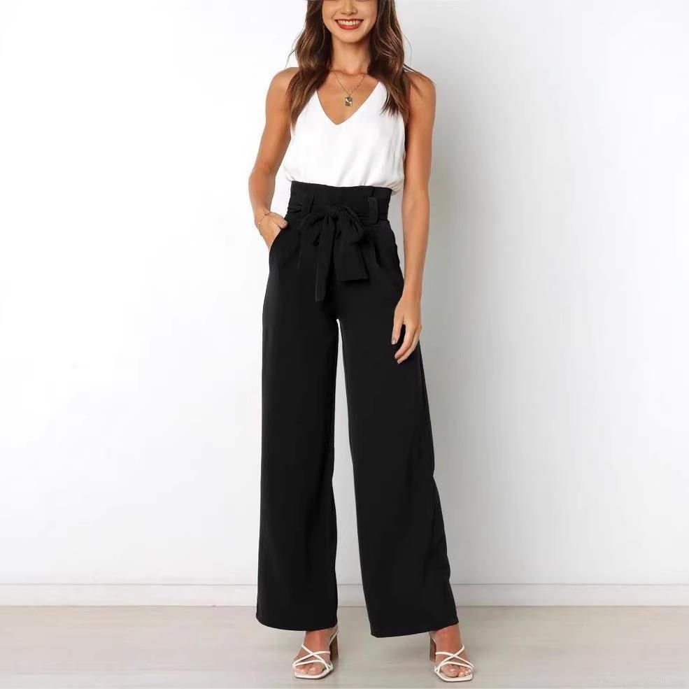 Women's High Waisted Wide Leg Pants With Bow Tie Belt Elegant Office Commute Solid Color Draped Trousers With Pockets Casual Slimming Long Pants