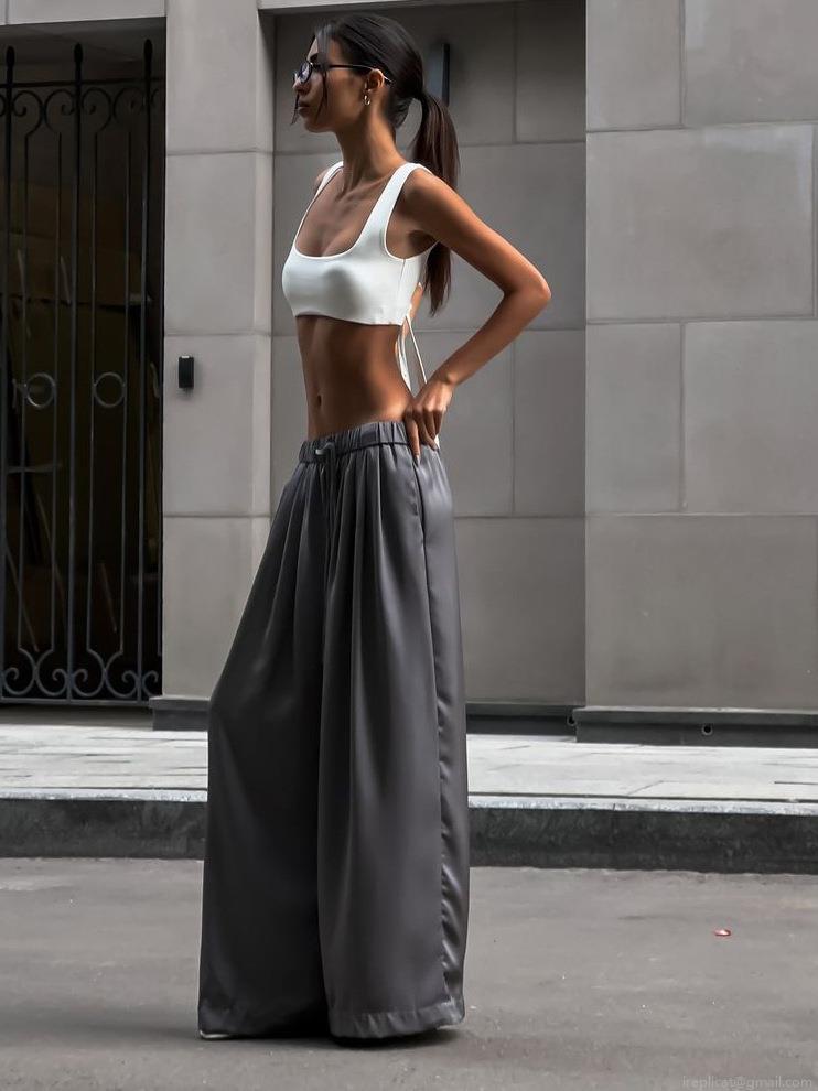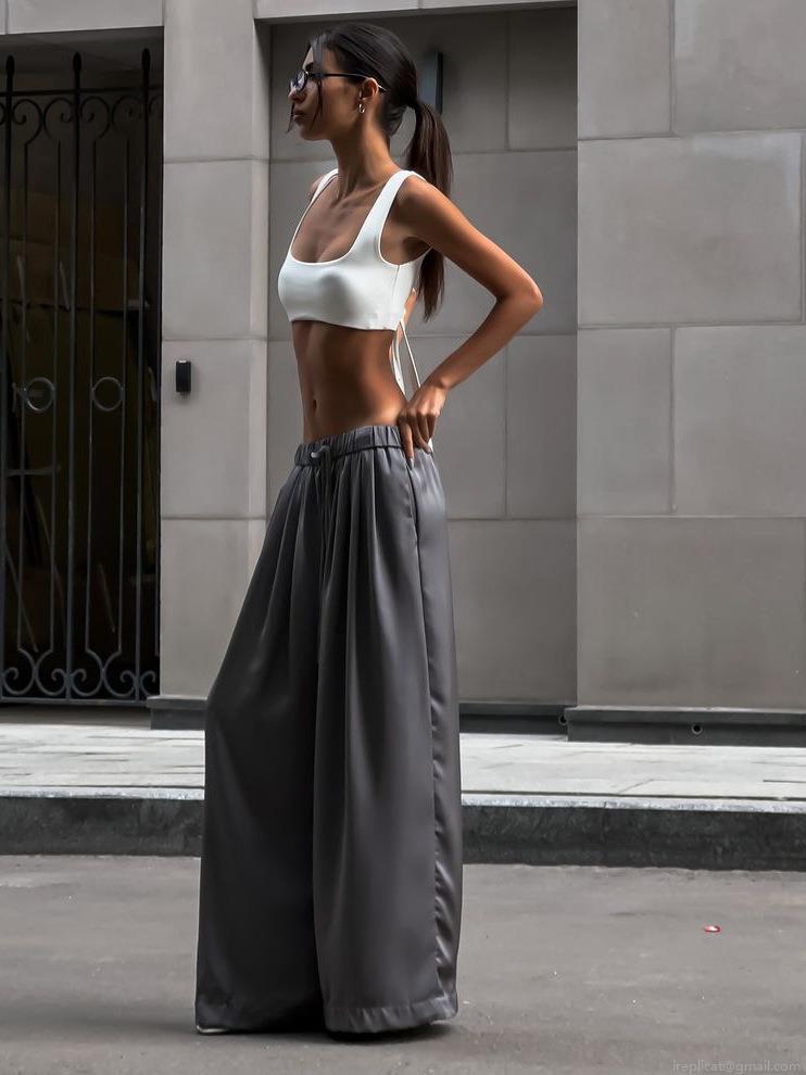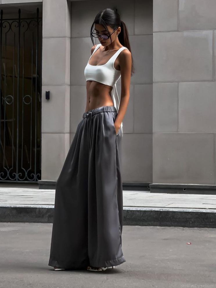 Solid Color, High-waisted, Drawstring Design, Glossy Finish, Wide-leg Cut, Flow