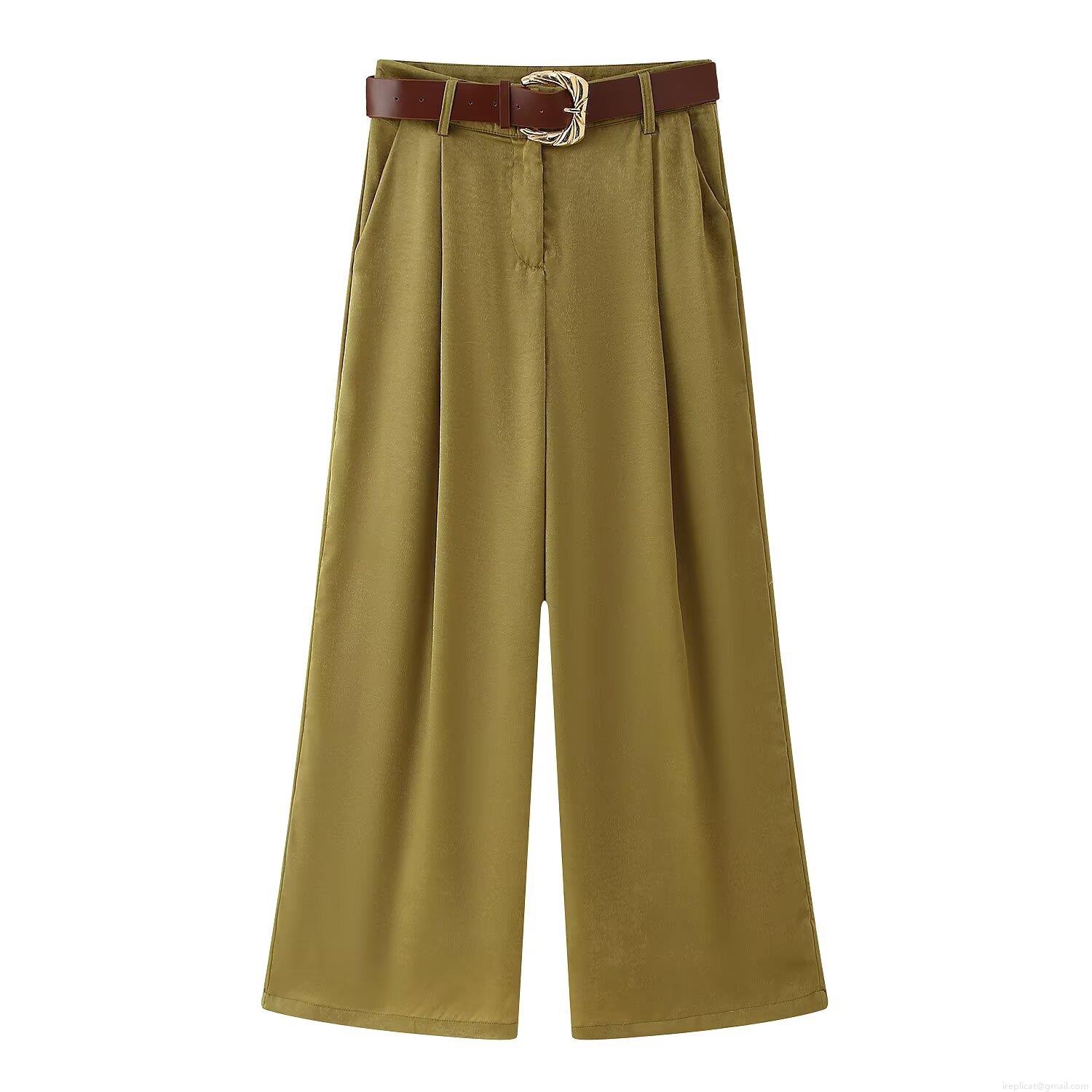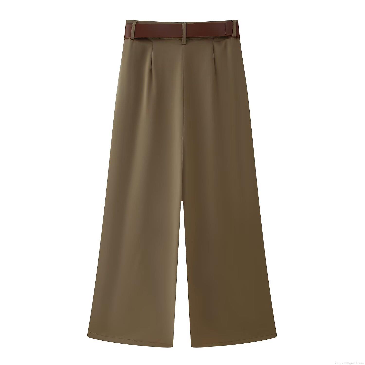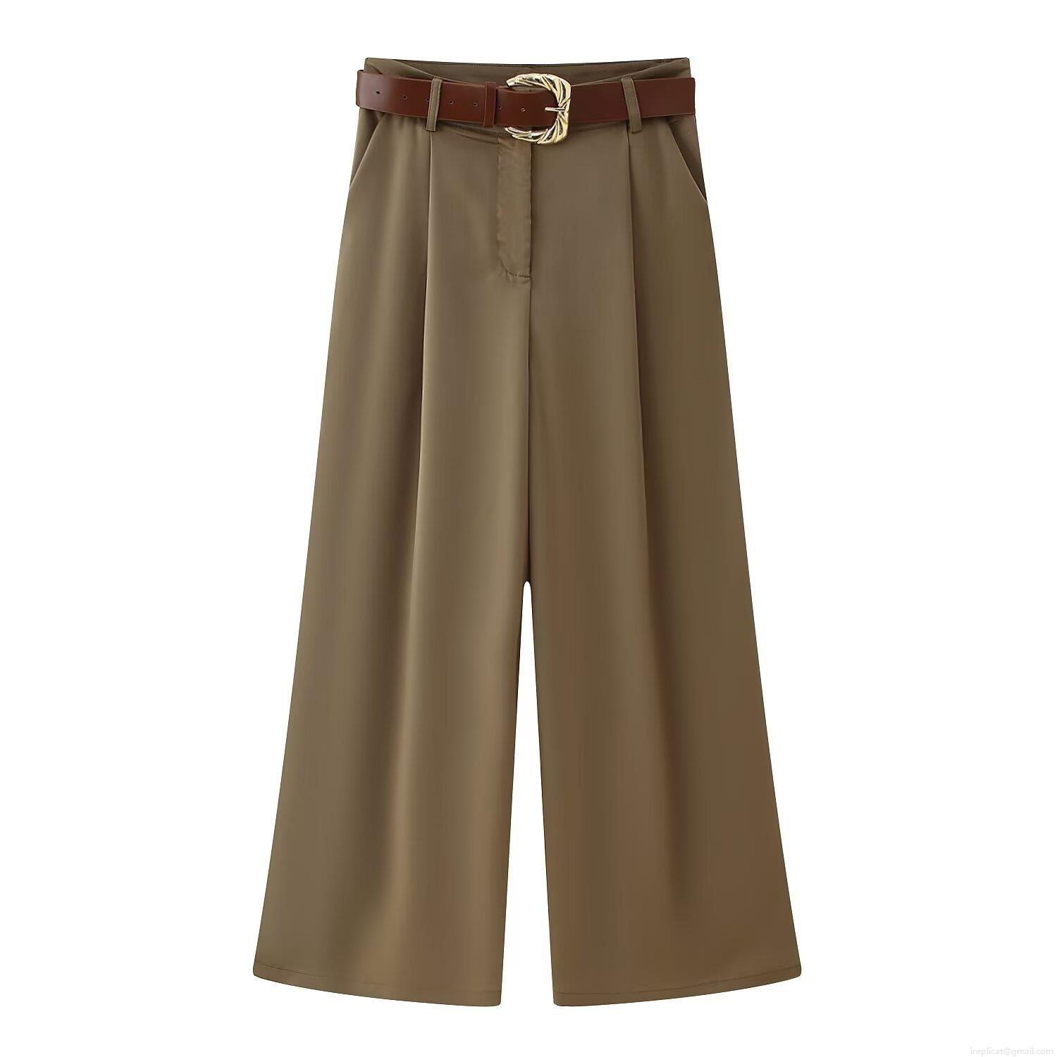 Women's High Waisted Wide Leg Trousers with Belt Solid Color Pleated Casual Loose Pants Autumn Streetwear Fashion Polyester Trousers