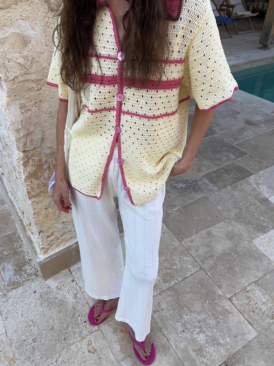 Stripe, Color Blocking, Hollow Out, Polo Collar, Crochet Hook