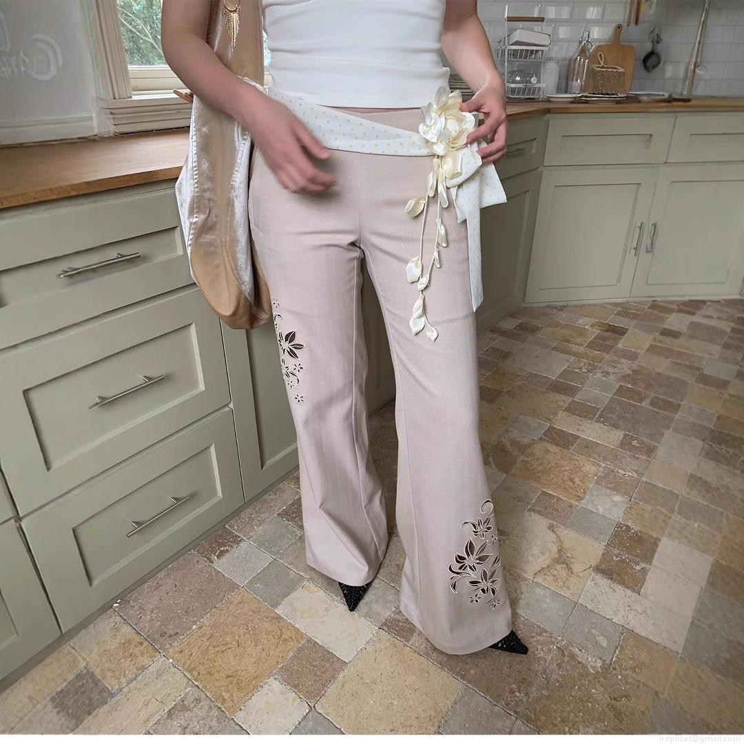 Women's Hollow Out Embroidery Flare Pants Elegant Low Waist Polyester Trousers Casual Chic Full Length Pants For Lady Office Party