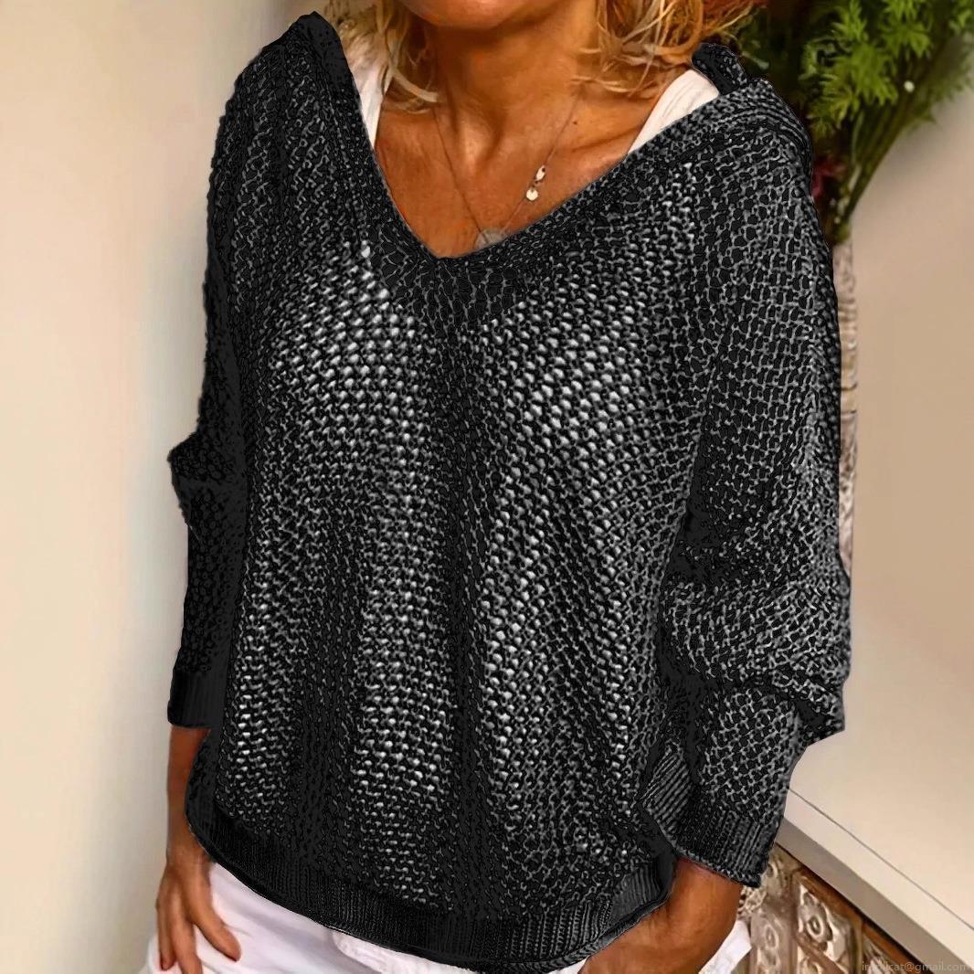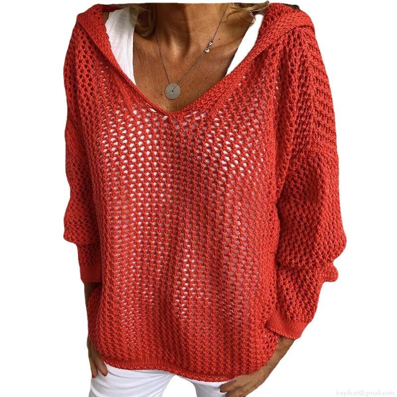 Women's Hollow Out Hooded Knit Sweater Loose V-Neck Long Sleeve Crochet Sun Protection Pullover Top Casual Summer Beach Breathable Knitwear