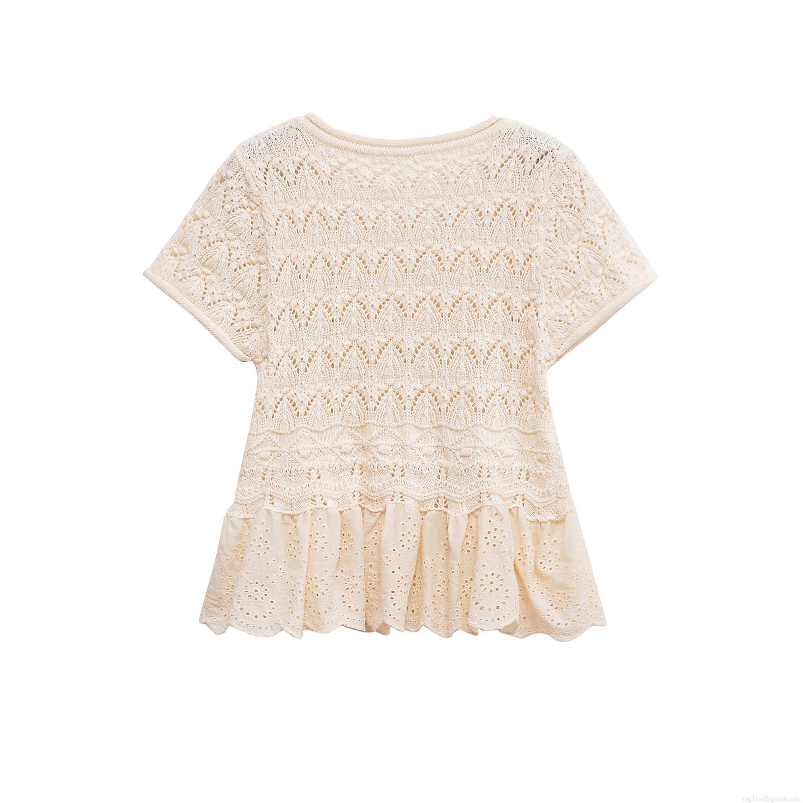 Women's Hollow Out Knit T-Shirt Short Sleeve Crochet Top With Lace Patchwork Hem Sweet Apricot Summer Tee Streetwear For Women